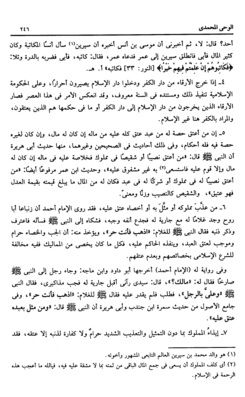 4 - إذا خرج الأرقاء من دار الكفر ودخلوا دار الإسلام يصيرون أحرارا، وعلى الحكومة الإسلامية تنفيذ ذلك ومستنده فى السنة معروف، وقد انعكس الأمر فى هذا العصر فصار الأرقاء الذين يخرجون من دار الإسلام إلى دار الكفر أو ما فى حكمها هم الذين يعتقون، والمراد بالكفر هنا غير الإسلام.