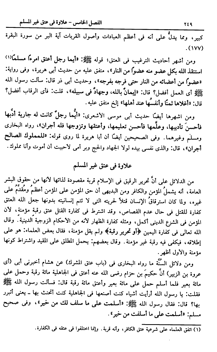 «عضوا من أعضائه من النار حتى فرجه بفرجه»، وحديث أبى ذر قال: سألت رسول الله صلّى الله عليه وسلّم أى العمل أفضل؟ قال: «إيمان بالله، وجهاد فى سبيله»، قلت: فأى الرقاب أفضل؟