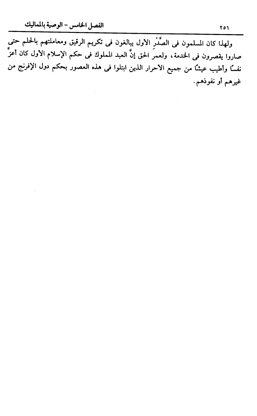 ولهذا كان المسلمون فى الصّدر الأول يبالغون فى تكريم الرقيق ومعاملتهم بالحلم حتى صاروا يقصرون فى الخدمة، ولعمر الحق إنّ العبد المملوك فى حكم الإسلام الأول كان أعزّ نفسا وأطيب عيشا من جميع الأحرار الذين ابتلوا فى هذه العصور بحكم دول الإفرنج من غيرهم أو نفوذهم.