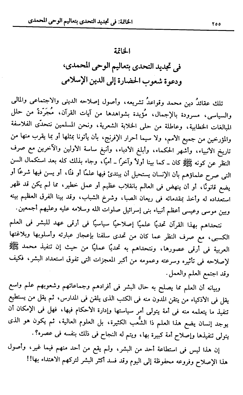 الخاتمة فى تجديد التحدى بتعاليم الوحى المحمدى، ودعوة شعوب الحضارة إلى الدين الإسلامى