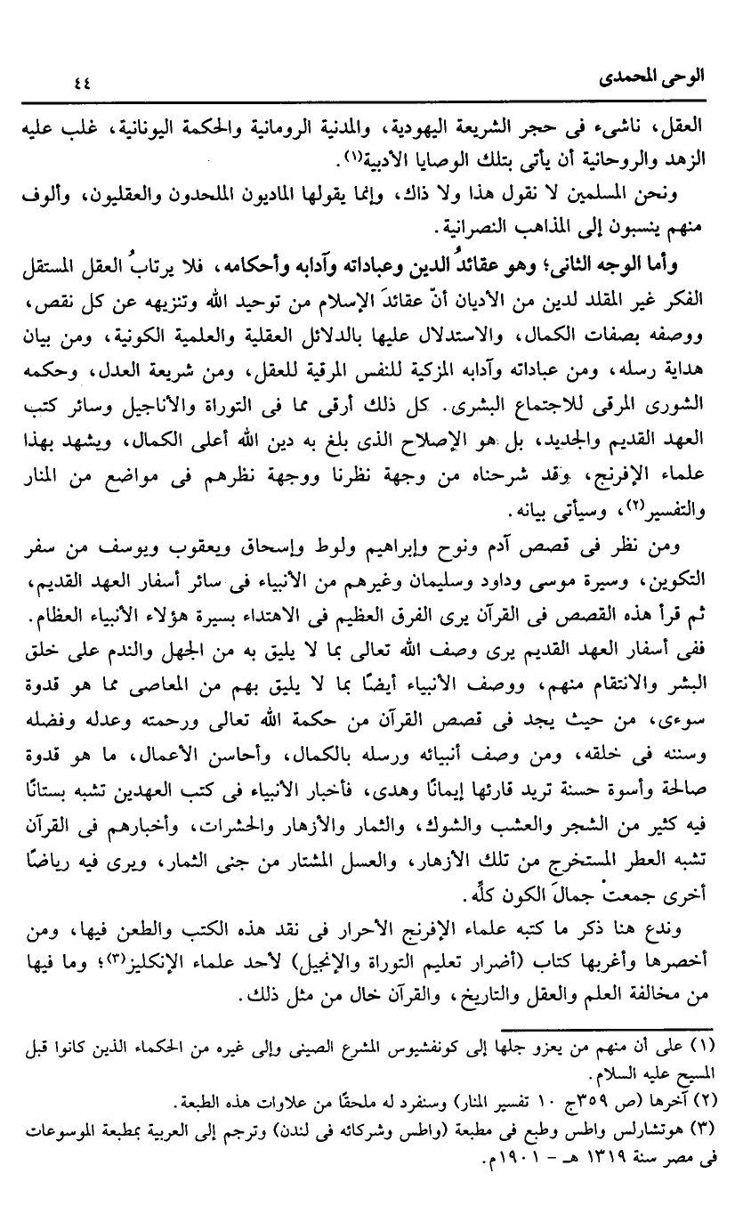 وأما الوجه الثانى؛ وهو عقائد الدين وعباداته وآدابه وأحكامه، فلا يرتاب العقل المستقل الفكر غير المقلد لدين من الأديان أنّ عقائد الإسلام من توحيد الله وتنزيهه عن كل نقص، ووصفه بصفات الكمال، والاستدلال عليها بالدلائل العقلية والعلمية الكونية، ومن بيان هداية رسله، ومن عباداته وآدابه المزكية للنفس المرقية للعقل، ومن شريعة العدل، وحكمه الشورى المرقى للاجتماع البشرى. كل ذلك أرقى مما فى التوراة والأناجيل وسائر كتب العهد القديم والجديد، بل هو الإصلاح الذى بلغ به دين الله