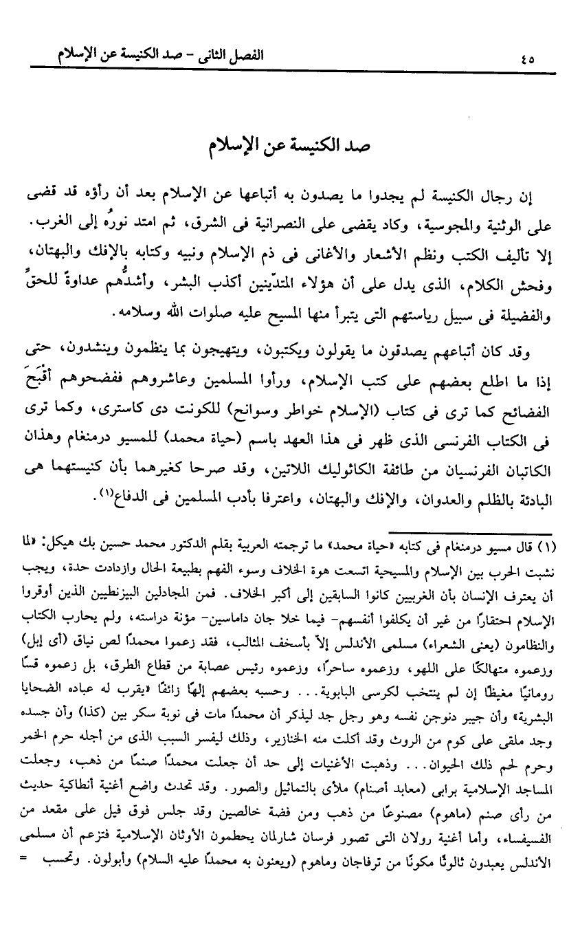 (1) قال مسيو درمنغام فى كتابه «حياة محمد» ما ترجمته العربية بقلم الدكتور محمد حسين بك هيكل: «لما نشبت الحرب بين الإسلام والمسيحية اتسعت هوة الخلاف وسوء الفهم بطبيعة الحال وازدادت حدة، ويجب أن يعترف الإنسان بأن الغربيين كانوا السابقين إلى أكبر الخلاف. فمن المجادلين البيزنطيين الذين أوقروا الإسلام احتقارا من غير أن يكلفوا أنفسهم- فيما خلا جان داماسين- مؤنة دراسته، ولم يحارب الكتاب والنظامون (يعنى الشعراء) مسلمى الأندلس إلّا بأسخف المثالب، فقد زعموا محمدا لص نياق (أى إبل) وزعموه متهالكا على اللهو، وزعموه ساحرا، وزعموه رئيس عصابة من قطاع الطرق، بل زعموه قسا رومانيا مغيظا إن لم ينتخب لكرسى البابوية ... وحسبه بعضهم إلها زائفا «يقرب له عباده الضحايا البشرية» وأن جبير دنوجن نفسه وهو رجل جد ليذكر أن محمدا مات فى نوبة سكر بين (كذا) وأن جسده وجد ملقى على كوم من الروث وقد أكلت منه الخنازير، وذلك ليفسر السبب الذى من أجله حرم الخمر وحرم لحم ذلك الحيوان ... وذهبت الأغنيات إلى حد أن جعلت محمدا صنما من ذهب، وجعلت المساجد الإسلامية برابى (معابد أصنام) ملأى بالتماثيل والصور. وقد تحدث واضع أغنية أنطاكية حديث من رأى صنم (ماهوم) مصنوعا من ذهب ومن فضة خالصين وقد جلس فوق فيل على مقعد من الفسيفساء، وأما أغنية رولان التى تصور فرسان شارلمان يحطمون الأوثان الإسلامية فتزعم أن مسلمى الأندلس يعبدون ثالوثا مكونا من ترفاجان وماهوم (ويعنون به محمدا عليه السلام) وأبولون. وتحسب