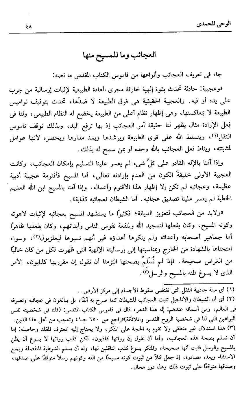 (3) هذا استدلال غير منطقى ولا تقوم به الحجة على المنكر، ولا يحتاج إليه المعترف المقلد وحاصله: إما أن نسلم بصحة هذه العجائب، وأما أن نقول إن رواتها كاذبون، لكن كذب رواتها لا يسوغ أن يظن بالمسيح والرسل فثبت أنها صحيحة، والمنكر يسوغ كذب الناقلين لها، وله أن يسلم الشرطية المنفصلة ويمنع الاستثناء ويعده مصادرة، إذ جعل كلا من ثبوت كونه مسيحا من الله وكونهم رسلا متوقفا على صدقها، وصدقها متوقفا على ثبوت ذلك وهذا دور محال.