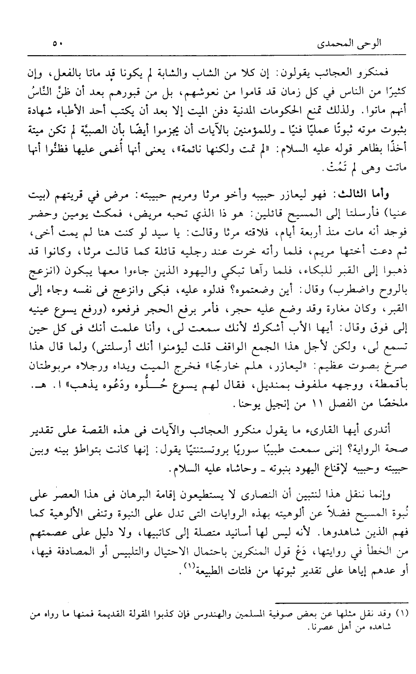 وإنما ننقل هذا لنتبين أن النصارى لا يستطيعون إقامة البرهان فى هذا العصر على نبوة المسيح فضلا عن ألوهيته بهذه الروايات التى تدل على النبوة وتنفى الألوهية كما فهم الذين شاهدوها. لأنه ليس لها أسانيد متصلة إلى كاتبيها، ولا دليل على عصمتهم من الخطأ في روايتها، دع قول المنكرين باحتمال الاحتيال والتلبيس أو المصادفة فيها، أو عدهم إياها على تقدير ثبوتها من فلتات الطبيعة «1».