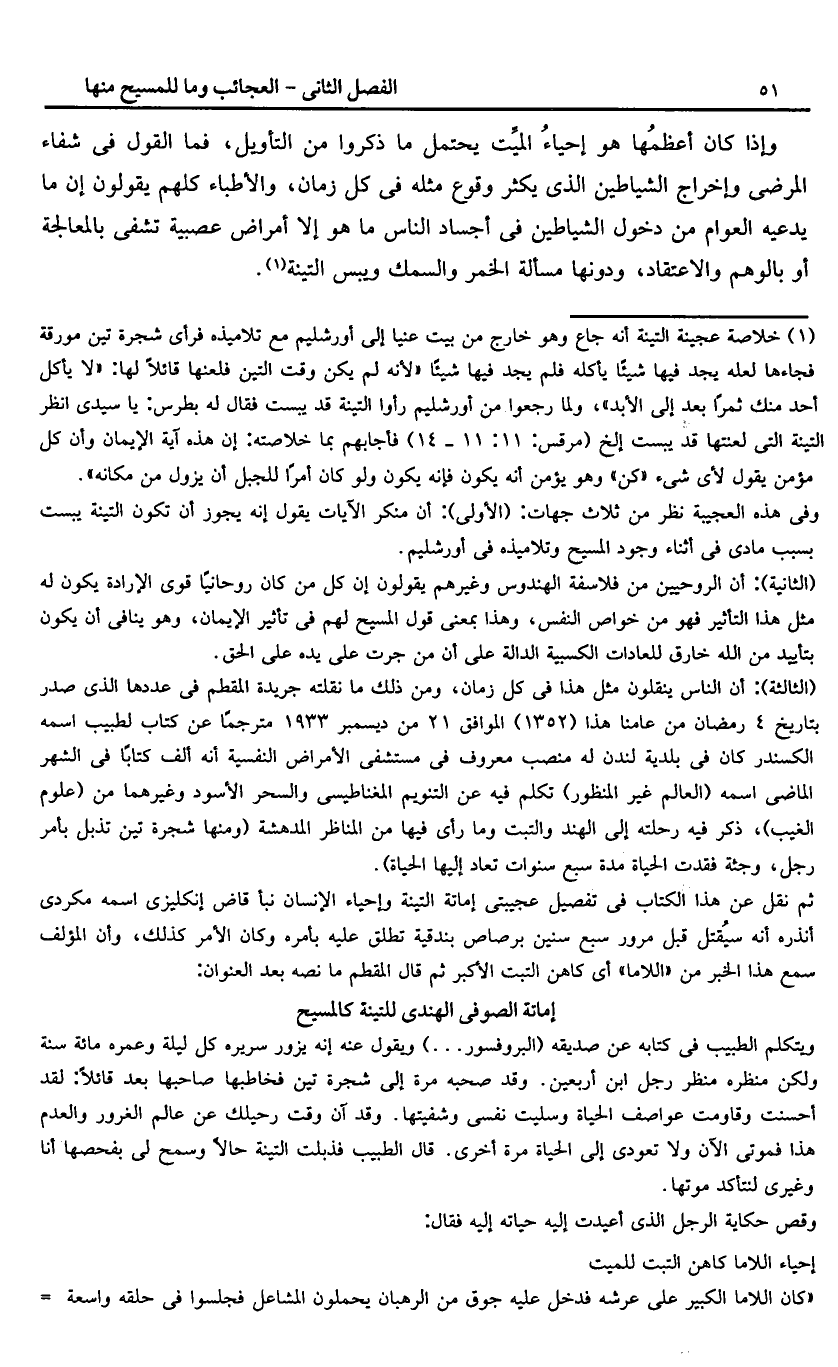 وإذا كان أعظمها هو إحياء الميّت يحتمل ما ذكروا من التأويل، فما القول فى شفاء المرضى وإخراج الشياطين الذى يكثر وقوع مثله فى كل زمان، والأطباء كلهم يقولون إن ما يدعيه العوام من دخول الشياطين فى أجساد الناس ما هو إلا أمراض عصبية تشفى بالمعالجة أو بالوهم والاعتقاد، ودونها مسألة الخمر والسمك ويبس التينة «1».