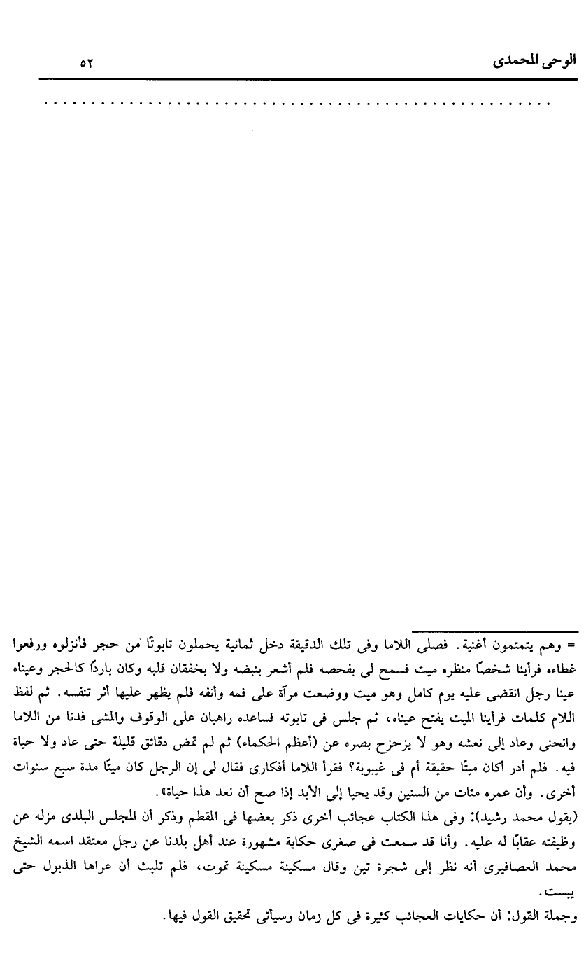 وهم يتمتمون أغنية. فصلى اللاما وفى تلك الدقيقة دخل ثمانية يحملون تابوتا من حجر فأنزلوه ورفعوا غطاءه فرأينا شخصا منظره ميت فسمح لى بفحصه فلم أشعر بنبضه ولا بخفقان قلبه وكان باردا كالحجر وعيناه عينا رجل انقضى عليه يوم كامل وهو ميت ووضعت مرآة على فمه وأنفه فلم يظهر عليها أثر تنفسه. ثم لفظ اللام كلمات فرأينا الميت يفتح عيناه، ثم جلس فى تابوته فساعده راهبان على الوقوف والمشى فدنا من اللاما وانحنى وعاد إلى نعشه وهو لا يزحزح بصره عن (أعظم الحكماء) ثم لم تمض دقائق قليلة حتى عاد ولا حياة فيه. فلم أدر أكان ميتا حقيقة أم فى غيبوبة؟ فقرأ اللاما أفكارى فقال لى إن الرجل كان ميتا مدة سبع سنوات أخرى. وأن عمره مئات من السنين وقد يحيا إلى الأبد إذا صح أن نعد هذا حياة».