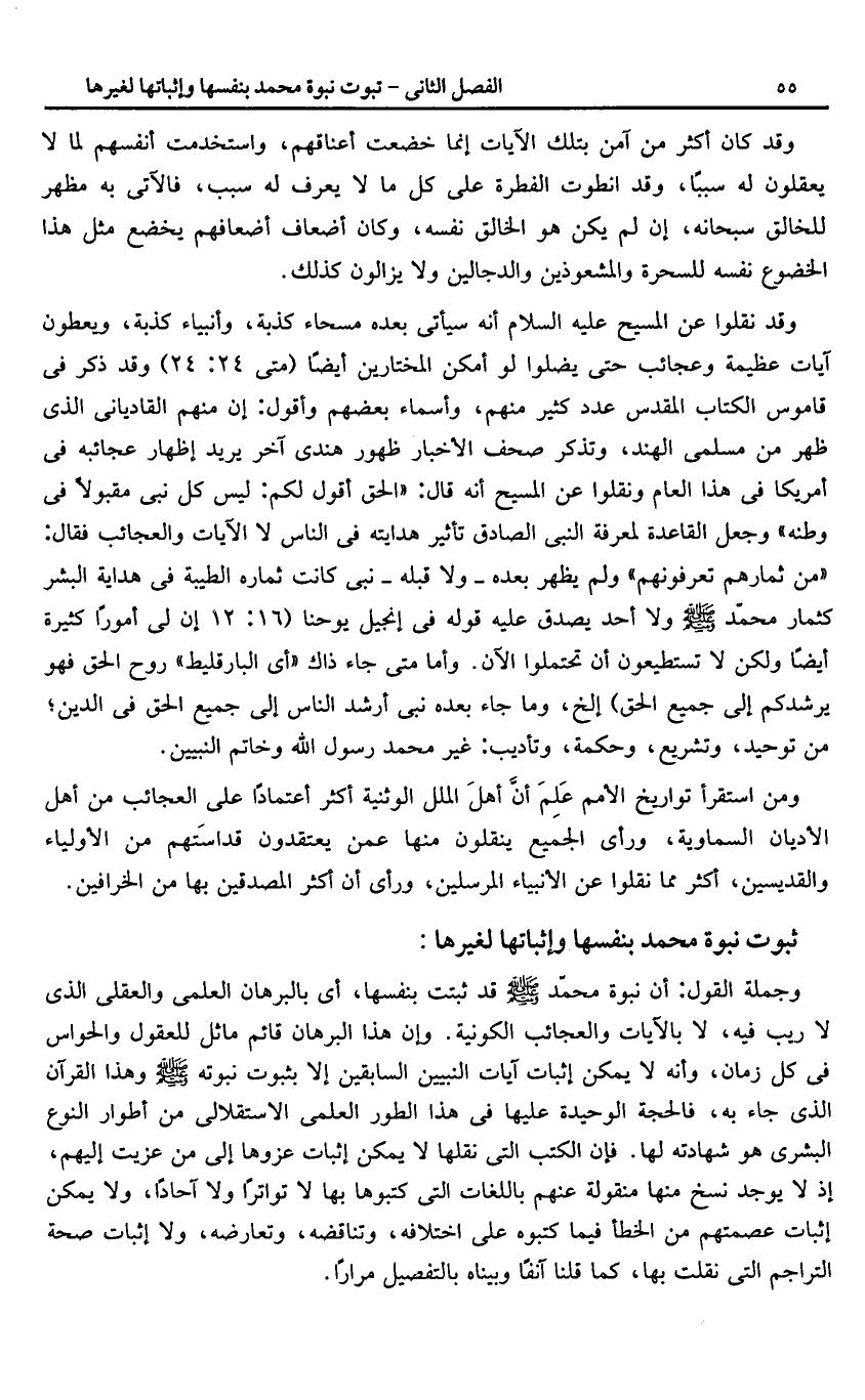 وجملة القول: أن نبوة محمّد صلّى الله عليه وسلم قد ثبتت بنفسها، أى بالبرهان العلمى والعقلى الذى لا ريب فيه، لا بالآيات والعجائب الكونية. وإن هذا البرهان قائم ماثل للعقول والحواس فى كل زمان، وأنه لا يمكن إثبات آيات النبيين السابقين إلا بثبوت نبوته صلّى الله عليه وسلم وهذا القرآن الذى جاء به، فالحجة الوحيدة عليها فى هذا الطور العلمى الاستقلالى من أطوار النوع البشرى هو شهادته لها. فإن الكتب التى نقلها لا يمكن إثبات عزوها إلى من عزيت إليهم، إذ لا يوجد نسخ منها منقولة عنهم باللغات التى كتبوها بها لا تواترا ولا آحادا، ولا يمكن إثبات عصمتهم من الخطأ فيما كتبوه على اختلافه، وتناقضه، وتعارضه، ولا إثبات صحة التراجم التى نقلت بها، كما قلنا آنفا وبيناه بالتفصيل مرارا.