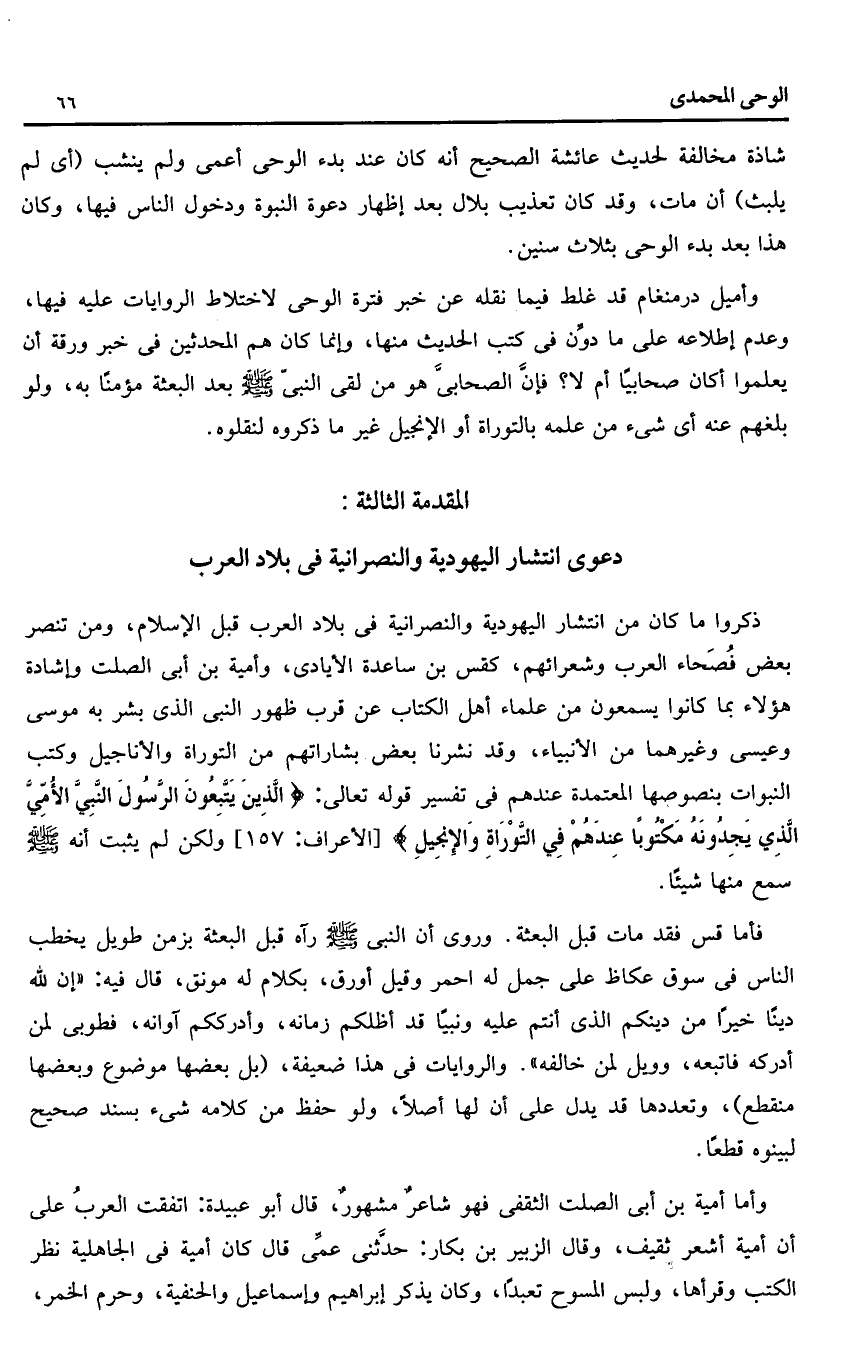 ذكروا ما كان من انتشار اليهودية والنصرانية فى بلاد العرب قبل الإسلام، ومن تنصر بعض فصحاء العرب وشعرائهم، كقس بن ساعدة الأيادى، وأمية بن أبى الصلت وإشادة هؤلاء بما كانوا يسمعون من علماء أهل الكتاب عن قرب ظهور النبى الذى بشر به موسى وعيسى وغيرهما من الأنبياء، وقد نشرنا بعض بشاراتهم من التوراة والأناجيل وكتب النبوات بنصوصها المعتمدة عندهم فى تفسير قوله تعالى: الَّذِينَ يَتَّبِعُونَ الرَّسُولَ النَّبِيَّ الْأُمِّيَّ الَّذِي يَجِدُونَهُ مَكْتُوباً عِنْدَهُمْ فِي التَّوْراةِ وَالْإِنْجِيلِ [الأعراف: 157] ولكن لم يثبت أنه صلّى الله عليه وسلم سمع منها شيئا.
