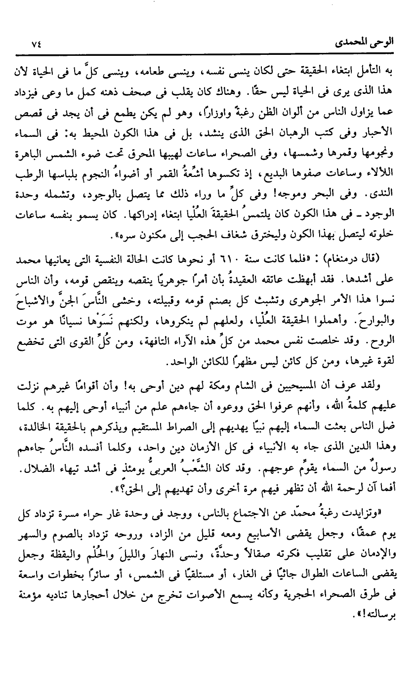(قال درمنغام): «فلما كانت سنة 610 أو نحوها كانت الحالة النفسية التى يعانيها محمد على أشدها. فقد أبهظت عاتقه العقيدة بأن أمرا جوهريا ينقصه وينقص قومه، وأن الناس نسوا هذا الأمر الجوهرى وتشبث كل بصنم قومه وقبيلته، وخشى النّاس الجنّ والأشباح والبوارح. وأهملوا الحقيقة العليا، ولعلهم لم ينكروها، ولكنهم نسوها نسيانا هو موت الروح. وقد خلصت نفس محمد من كلّ هذه الآراء التافهة، ومن كلّ القوى التى تخضع لقوة غيرها، ومن كل كائن ليس مظهرا للكائن الواحد.