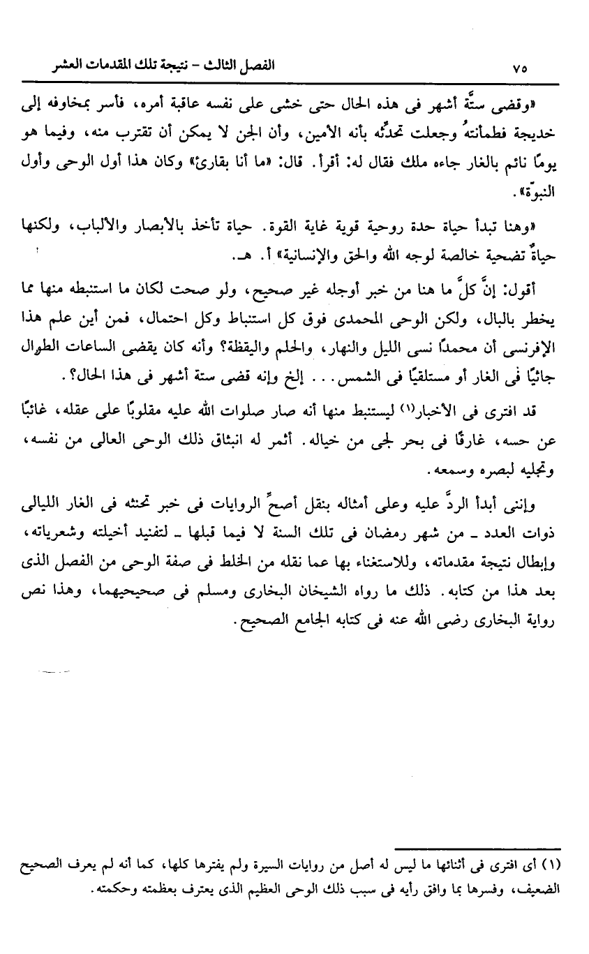 أقول: إنّ كلّ ما هنا من خبر أو جله غير صحيح، ولو صحت لكان ما استنبطه منها مما يخطر بالبال، ولكن الوحى المحمدى فوق كل استنباط وكل احتمال، فمن أين علم هذا الإفرنسى أن محمدا نسى الليل والنهار، والحلم واليقظة؟ وأنه كان يقضى الساعات الطوال جاثيا فى الغار أو مستلقيا فى الشمس ... إلخ وإنه قضى ستة أشهر فى هذا