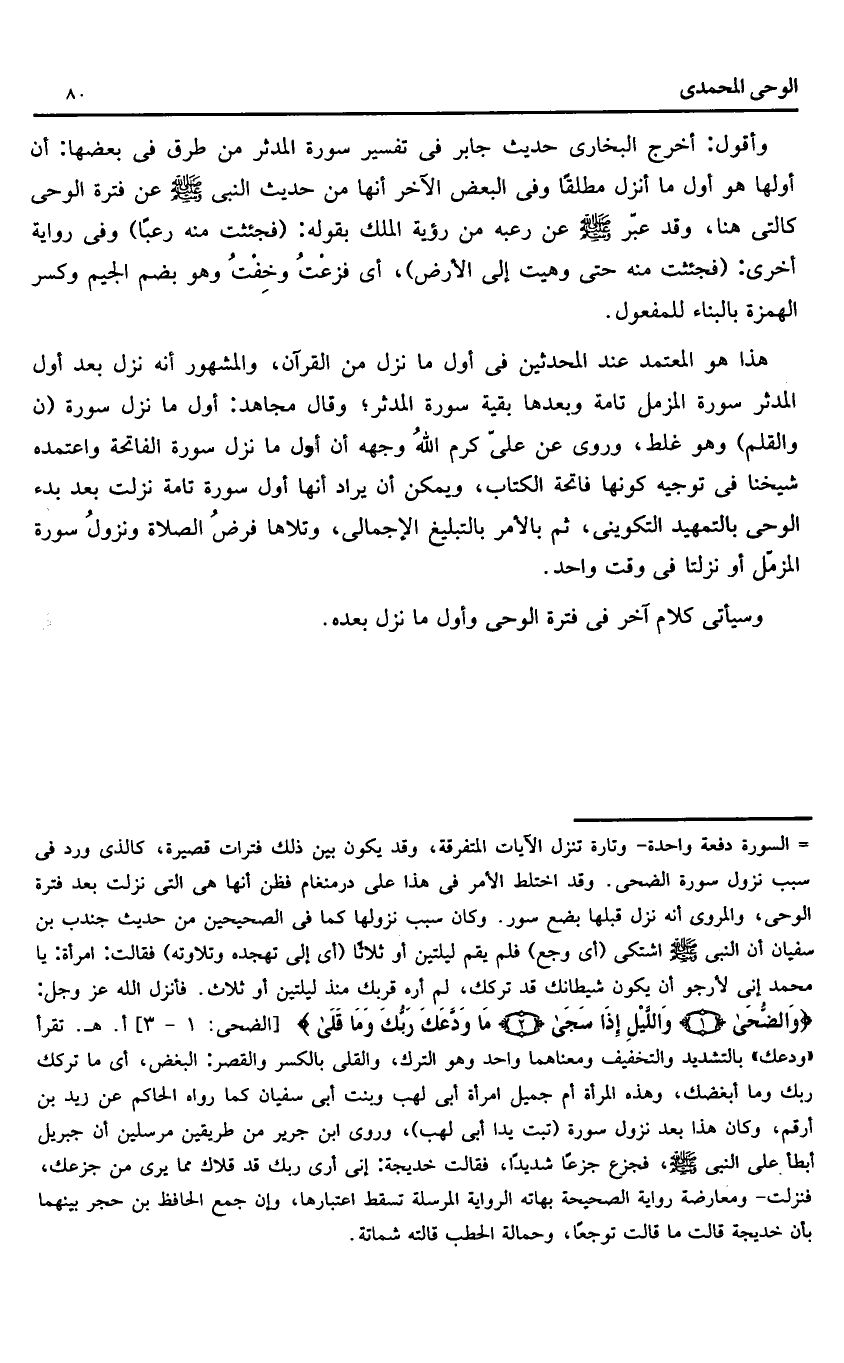 السورة دفعة واحدة- وتارة تنزل الآيات المتفرقة، وقد يكون بين ذلك فترات قصيرة، كالذى ورد فى سبب نزول سورة الضحى. وقد اختلط الأمر فى هذا على درمنغام فظن أنها هى التى نزلت بعد فترة الوحى، والمروى أنه نزل قبلها بضع سور. وكان سبب نزولها كما فى الصحيحين من حديث جندب بن سفيان أن النبى صلّى الله عليه وسلم اشتكى (أى وجع) فلم يقم ليلتين أو ثلاثا (أى إلى تهجده وتلاوته) فقالت: امرأة: يا محمد إنى لأرجو أن يكون شيطانك قد تركك، لم أره قربك منذ ليلتين أو ثلاث. فأنزل الله عز وجل:
