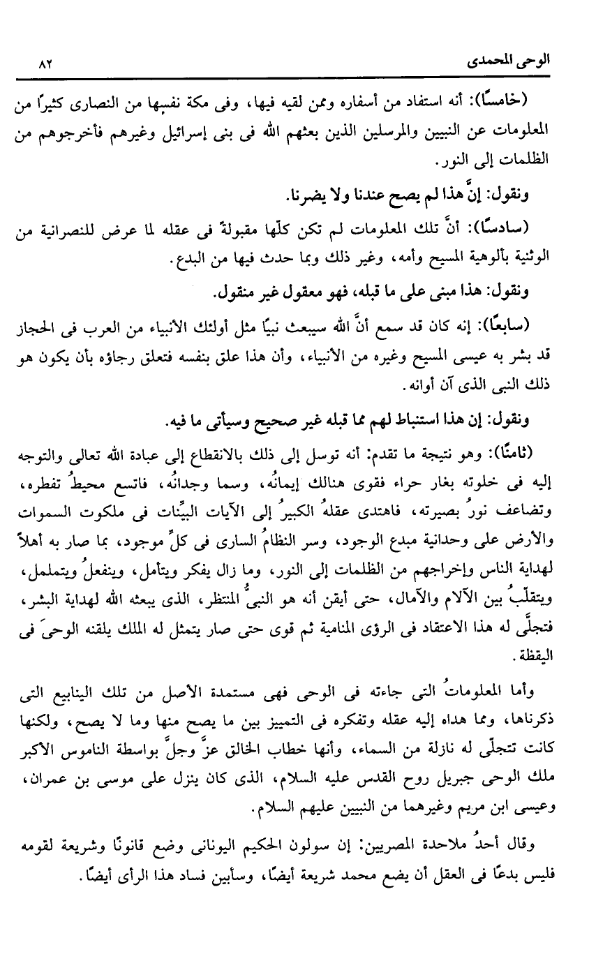 وأما المعلومات التى جاءته فى الوحى فهى مستمدة الأصل من تلك الينابيع التى ذكرناها، ومما هداه إليه عقله وتفكره فى التمييز بين ما يصح منها وما لا يصح، ولكنها كانت تتجلّى له نازلة من السماء، وأنها خطاب الخالق عزّ وجلّ بواسطة الناموس الأكبر ملك الوحى جبريل روح القدس عليه السلام، الذى كان ينزل على موسى بن عمران، وعيسى ابن مريم وغيرهما من النبيين عليهم السلام.