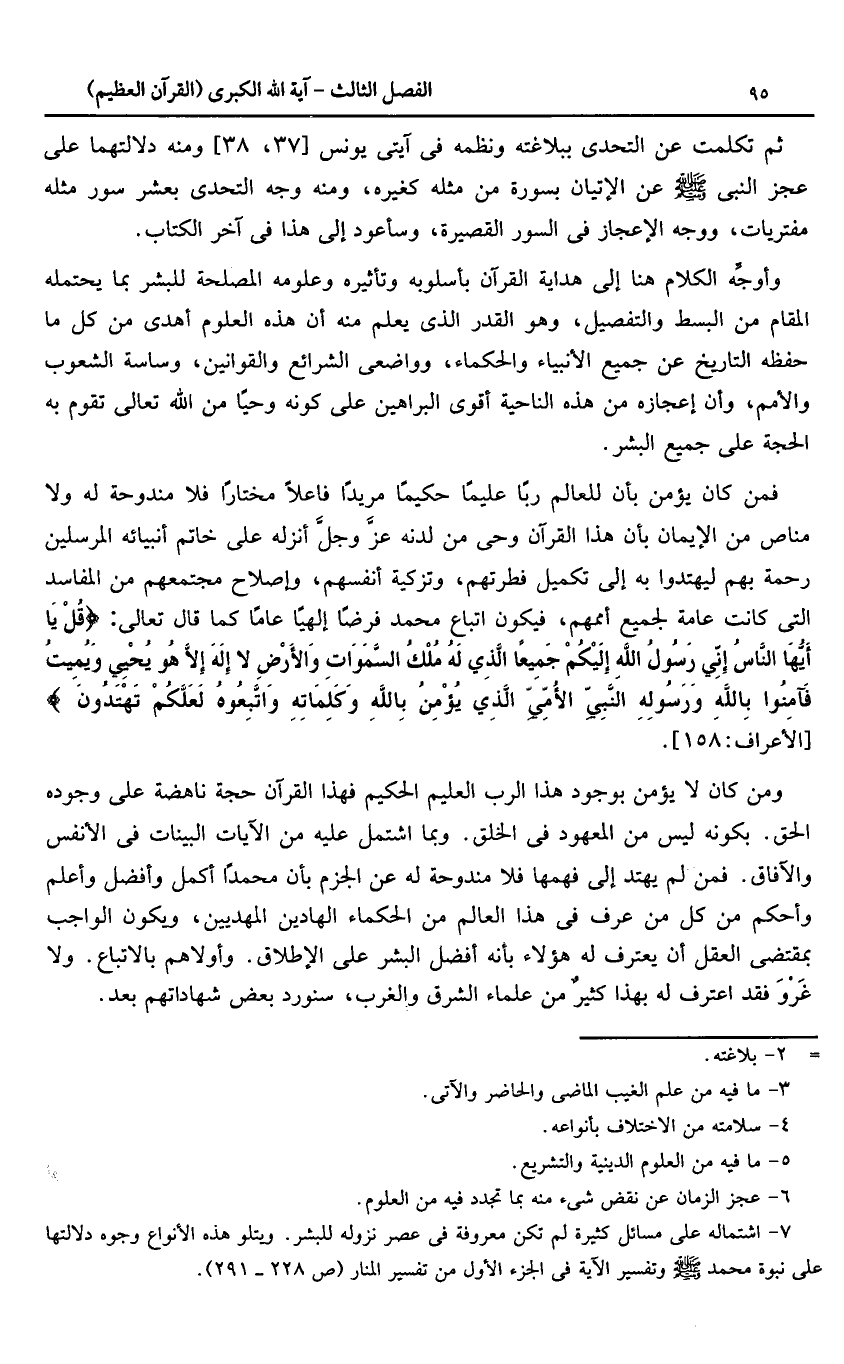 7 - اشتماله على مسائل كثيرة لم تكن معروفة فى عصر نزوله للبشر. ويتلو هذه الأنواع وجوه دلالتها على نبوة محمد صلّى الله عليه وسلم وتفسير الآية فى الجزء الأول من تفسير المنار (ص 228 - 291).