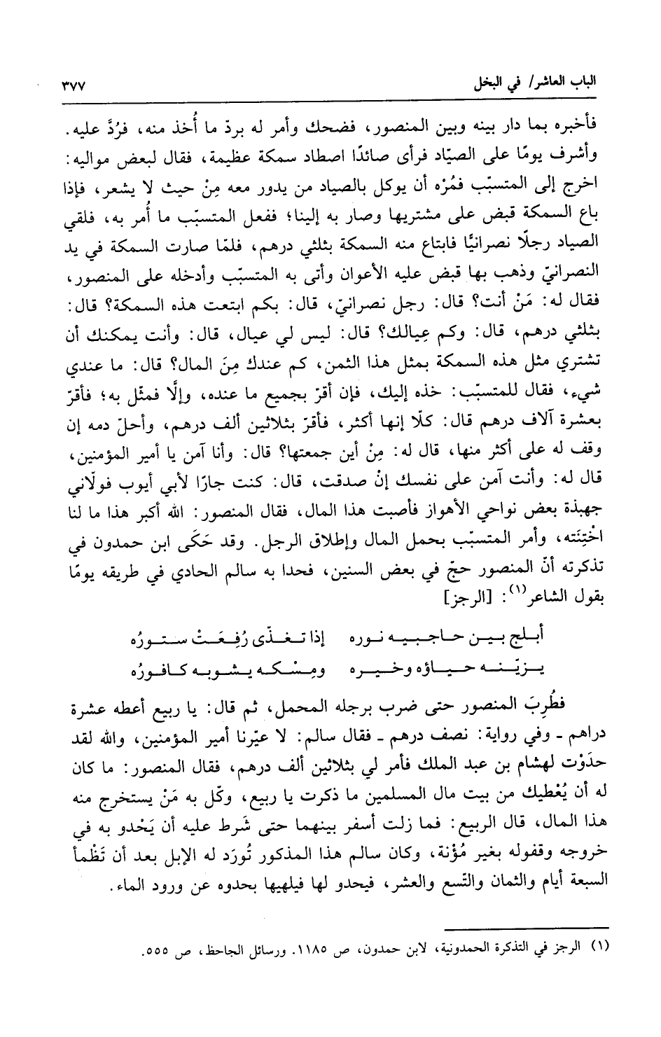 فأخبره بما دار بينه وبين المنصور فضحك وأمر له برد ما أخذ منه فرد عليه وأشرف يوماً على الصياد فرأى صائداً اصطاد سمكة عظيمة فقال لبعض مواليه اخرج إلى المتسبب فمره أن يوكل بالصياد من يدور معه من حيث لا يشعر فإذا باع السمكة قبض على مشتريها وصار به إلينا ففعل المتسبب ما أمر به فلقى الصياد رجلاً نصرانياً فابتاع منه السمكة بثلثي درهم فلما صارت السمكة في يد النصراني وذهب بها قبض عليه الأعوان وأتى به المتسبب وأدخله على المنصور فقال له من أنت قال رجل نصراني قال بكم ابتعت هذه السمكة قال بثلثي درهم قال وكم عيالك قال ليس لي عيال قال وأنت يمكنك أن تشتري مثل هذه السمكة بمثل هذا الثمن كم عندك من المال قال ما عندي شيء فقال للمتسبب خذه إليك فإن أقر بجميع ما عنده وإلا فمثل به فأقر بعشرة آلاف درهم قال كلا إنها أكثر فأقر بثلاثين ألف درهم وأحل دمه إن وقف له على أكثر منها قال له من أين جمعتها قال وأنا آمن يا أمير المؤمنين قال له وأنت آمن على نفسك إن صدقت قال كنت جاراً لأبي أيوب فولاني جهبذة بعض نواحي الأهواز فأصبت هذا المال فقال المنصور الله أكبر هذا مالنا اختنته وأمر المتسبب بحمل المال واطلاق الرجل وقد حكى ابن حمدون في تذكرته أن المنصور حج في بعض السنين فحدا به سالم الحادي في طريقه يوماً بقول الشاعر