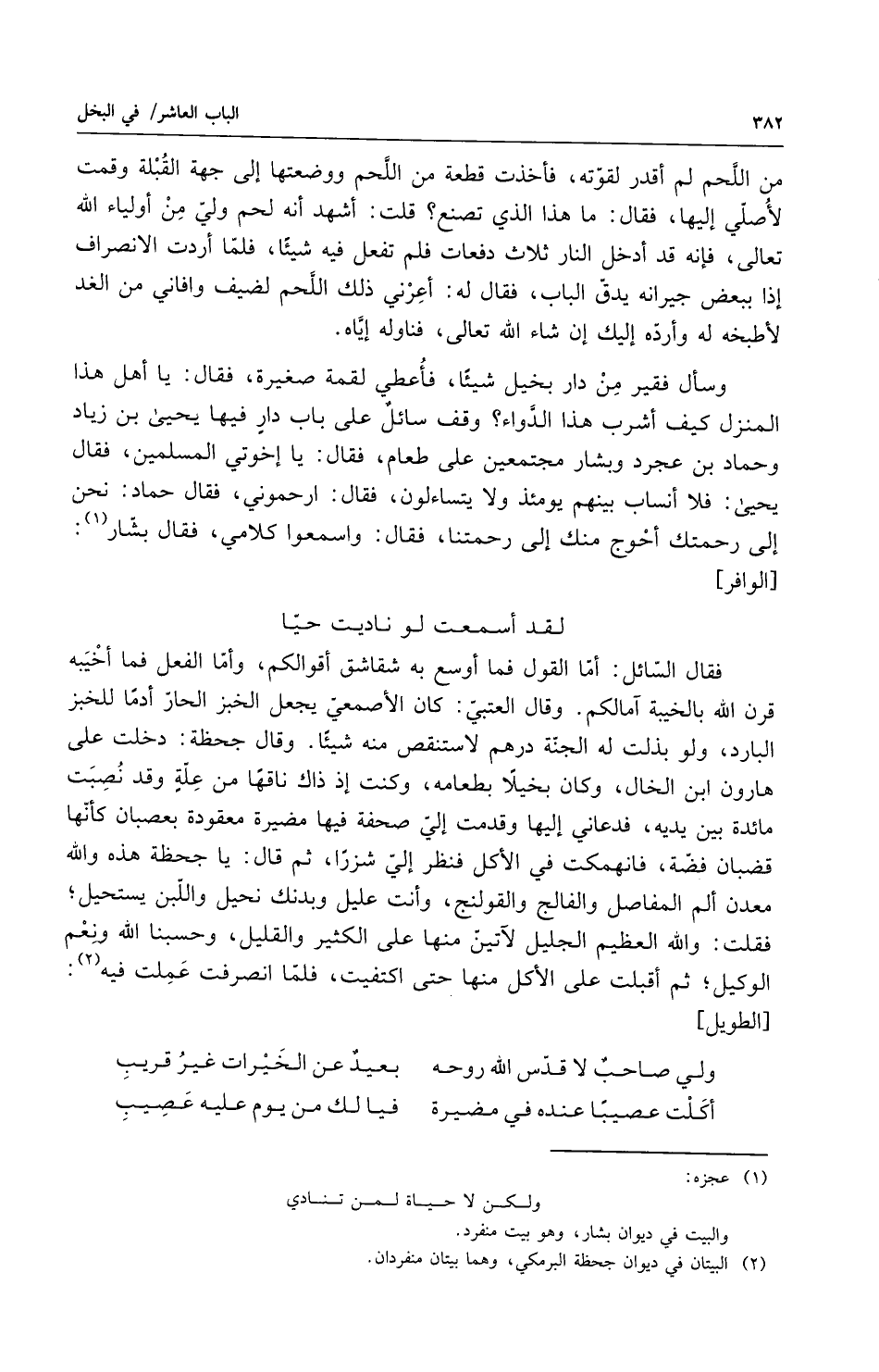 من اللحم فلم أقدر لقوته فأخذت قطعة من اللحم ووضعتها إلى جهة القبلة وقمت لأصلي إليها فقال ما هذا الذي تصنع قلت أشهد أنه لحم ولي من أولياء الله تعالى فإنه قد أدخل النار ثلاث دفعات فلم تفعل فيه شيأً فلما أردت الانصراف إذا ببعض جيرانه يدق الباب فقال له أعرني ذلك اللحم لضيف وأفاني من الغد لأطبخه له وأرده إليك إن شاء الله تعالى فناوله إياه وسأل فقير من دار بخيل شيأً فأعطى لقمة صغيرة فقال يا أهل هذا المنزل كيف أشرب هذا الدواء وقف سائل على باب دار فيها يحيى بن زياد وحماد بن عجرد وبشار مجتمعين على طعام فقال يا اخوتي المسلمين فقال يحيى فلا أنساب بينهم يومئذ ولا يتساءلون فقال ارحموني فقال حماد نحن إلى رحمتك أحوج منك إلى رحمتنا فقال واسمعوا كلامي فقال بشار لقد اسمعت لو ناديت حياً فقال السائل أما القول فما أوسع به شقاشق أقوالكم وأما الفعل فما أخيبه قرن الله بالخيبة آمالكم وقال العتبي كان الأصمعي يجعل الخبز الحار أدما للخبز البارد ولو بذلت له الجنة بدرهم لاستنقص منه شيأً وقال جحظة دخلت على هرون ابن الخال وكان بخيلاً بطعامه وكنت إذ ذاك ناقها من علة وقد نصبت مائدة بين يديه فدعاني إليها وقدمت إلي صحفة فيها مضيرة معقودة بعصبان كأنها قضبان فضة فانهمكت في الأكل فنظر إلي شزراً ثم قال يا جحظة هذه والله معدن ألم المفاصل والفالج واللقوة والقولنج وأنت عليل وبدنك نحيل واللبن يستحيل فقلت والله العظيم الجليل لآتين منها على الكثير والقليل وحسبنا الله ونعم الوكيل ثم أقبلت على الأكل منها حتى اكتفيت فلما انصرفت عملت فيه