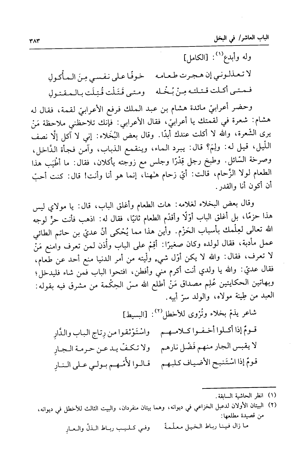 وحضر اعرابي مائدة هشام بن عبد الملك فرفع الاعرابي لقمة فقال له هشام شعرة في لقمتك يا أعرابي فقال الأعرابي فإنك تلاحظني ملاحظة من يرى الشعرة والله لا أكلت عندك أبداً وقال بعض البخلاء إني لا آكل إلا نصف الليل قيل له ولم قال يبرد الماء وينقمع الذباب وآمن فجأة الداخل وصرخة السائل وطبخ رجل قدراً وجلس مع زوجته يأكلان فقال ما أطيب هذا الطعام لولا الزحام قالت أي زحام ههنا إنما هو أنا وأنت قال كنت أحب أن أكون أنا والقدر وقال بعض البخلاء لغلامه هات الطعام واغلق الباب قال يا مولاي ليس هذا حزماً بل أغلق الباب أولاً وأقدم الطعام ثانياً فقال له اذهب فأنت حر لوجه الله تعالى لعلمك بأسباب الحزم وأين هذا مما يحكي أن عدي بن حاتم الطائي عمل مأدبة فقال لولده وكان صغيراً أقم على الباب وأذن لمن تعرف وامنع من لا تعرف فقال والله لا يكن أول شيء وليته من أمر الدنيا منع أحد عن طعام فقال عدي والله يا ولدي أنت أكرم مني وأفطن افتحوا الباب فمن شاء فليدخل وبهاتين الحكايتين علم مصداق من أطلع الله شمس الحكمة من مشرق فيه بقوله العبد من طينة مولاه والولد سرابيه شاعر يذم بخلاء وتروى للأخطل