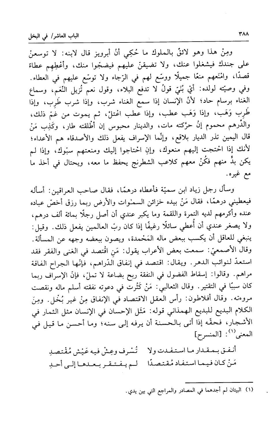 ومن هذا وهو لائق بالملوك ما حكى إن ابرويز قال لابنه لا توسعن على جندك فيشتغلوا عنك ولا تضيقن عليهم فيضجوا منك وأعطهم عطاء قصداً وأمنعهم منعاً جميلاً ووسع لهم في الرجاء ولا توسع عليهم في العطاء وفي وصيته لولده أي بني قول لا تدفع البلاء وقول نعم تزيل النعم وسماع الغناء برسام حاد لان الانسان إذا سمع الغناء شرب وإذا شرب طرب وإذا طرب وهب وإذا وهب عطب وإذا عطب اعتل ثم يموت من غم ذلك والدرهم محموم إن حركته مات والدينار محبوس إن أطلقته طار وكذب من قال اليمين تذر الديار بلاقع وإنما الاسراف يفعل ذلك والأصدقاء هم الأعداء لأنك إذا احتجت إليهم منعوك وإن احتاجوا إليك ومنعتهم سبوك وإذا لم يكن لك بد منهم فكن معهم كلاعب الشطرنج يحفظ ما معه ويحتال في أخذ ما مع غيره وسأل رجل زياد ابن سمية فأعطاه درهماً فقال صاحب العراقين أسأله فيعطيني درهماً فقال من بيده خزائن السموات والأرض ربما رزق أخص عباده عنده وأكرمهم لديه التمرة واللقمة وما يكبر عندي إن أصل رجلاً بمائة ألف درهم ولا يصغر عندي أن أعطي سائلاً رغيفاً إذا كان رب العالمين يفعل ذلك وقيل ينبغي للعاقل أن يكسب ببعض ماله المحمدة ويصون ببعضه وجهه عن المسئلة وقال الأصمعي سمعت بعض الأعراب يقول من اقتصد في الغنى والفقر فقد استعد لنوائب الدهر ويقال اقتصد في انفاق الدراهم فانها الجراح الفاقة مراهم وقالوا اسقاط الفضول في النفقة ربح بضاعة لا تمل فان الاسراف ربما كان سبباً في التقتير وقال الثعالبي من كثرت في دعوته نفقته أسلم ماله ونقصت مروأته وقال أفلاطون راس العقل الاقتصاد في الانفاق من غير بخل ومن الكلام البديع للبديع الهمذاني قوله مثل الاحسان في الانسان مثل الثمار في الأشجار فحقه إذا أتى بالحسنة أن يرفه إلى سنه وما أحسن ما قيل في المعنى