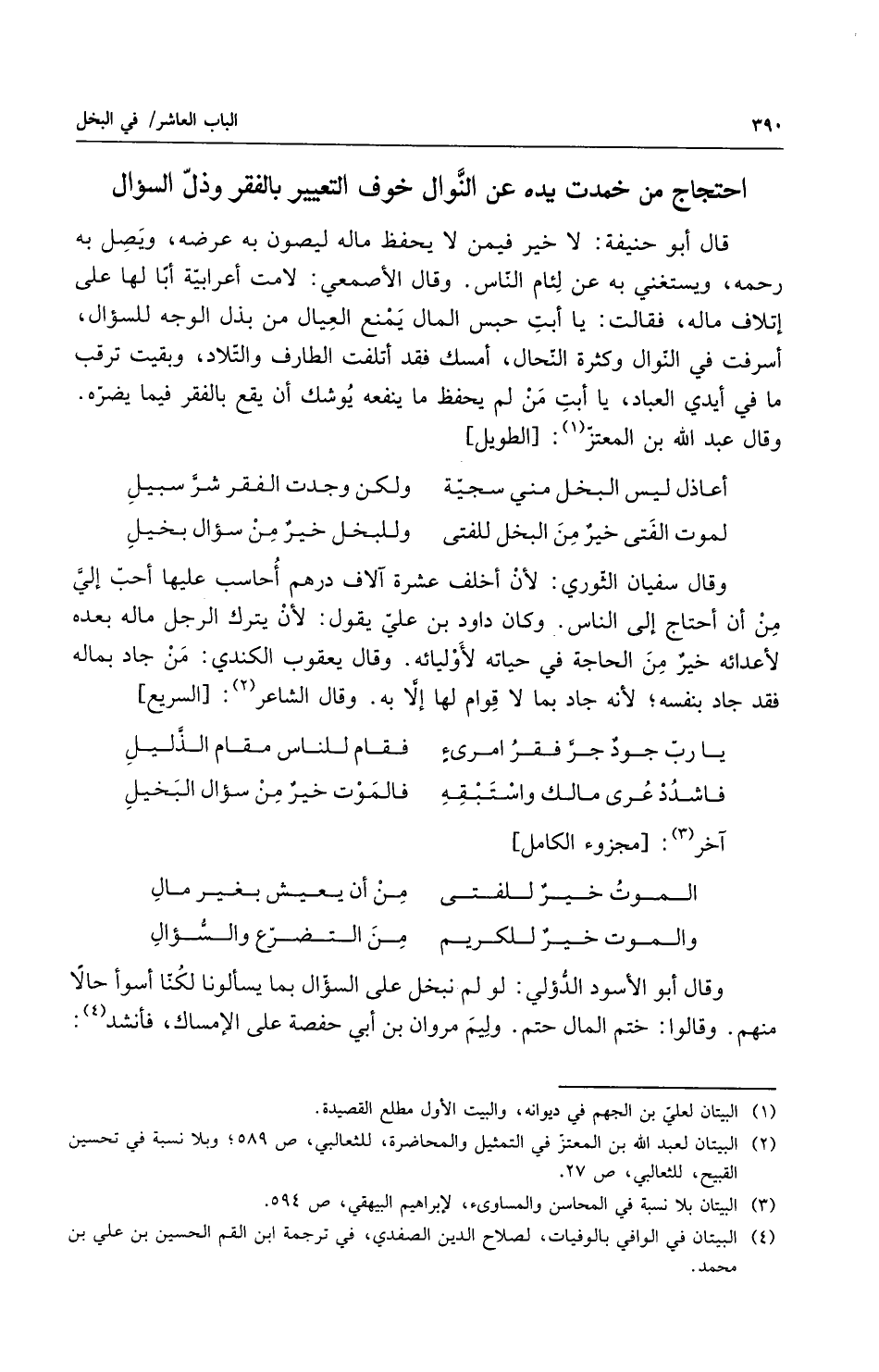 وقال سفيان الثوري لان أخلف عشرة آلاف درهم أحاسب عليها أحب إلي من أن أحتاج إلى الناس وكان داود بن علي يقول لابن يترك الرجل ماله بعده لاعدائه خير من الحاجة في حياته لأوليائه وقال يعقوب الكندي من جاد بماله فقد جاد بنفسه لأنه جاد بما لا قوام لها إلا به وقال الشاعر