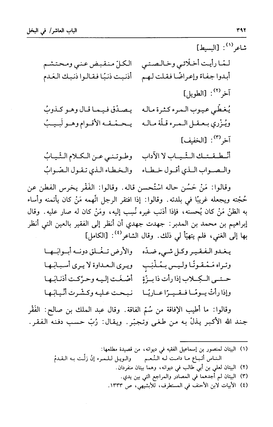 وقالوا من حسن حاله استحسن قاله وقالوا الفقر يخرس الفطن عن حجته ويجعله غريباً في بلدته وقالوا إذا افتقر الرجل اتهمه من كان يأتمنه وأساء به الظن من كان يحسنه فإذا أذنب غيره نسب إليه ومن كان له صار عليه وقال إبراهيم بن محمد بن المدبر جهدت جهدي أن أنظر إلى الفقير بالعين التي أنظر بها لغني فلم يتهيأ لي ذلك وقال الشاعر