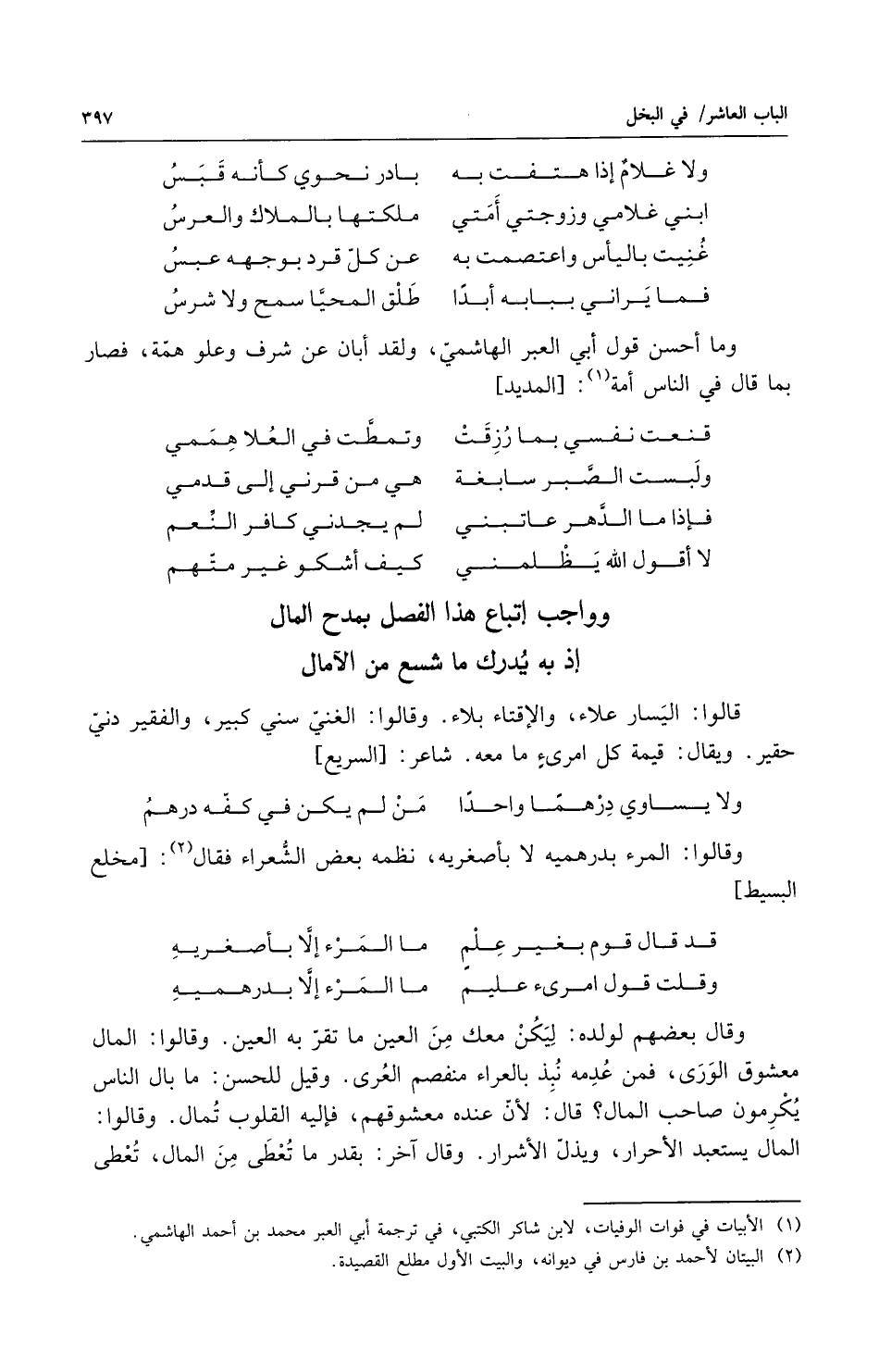 وواجب اتباع هذا الفصل بمدح المال ... إذ به يدرك ما شسع من الآمال