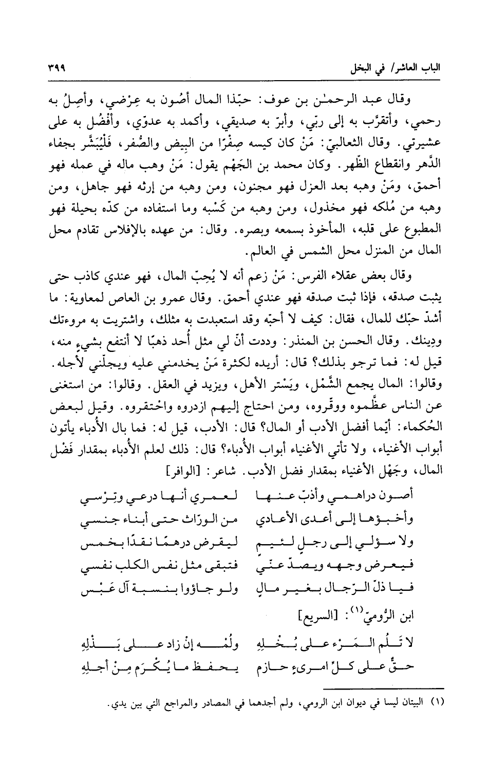 وقال عبد الرحمن بن عوف حبذا المال أصون به عرضي وأصل به رحمي وأتقرب به إلى ربي وأبر به صديقي وأكمد به عدوي وأفضل به على عشيرتي وقال الثعالبي من كان كيسه صفراً من البيض والصفر فليبشر بجفاء الدهر وانقطاع الظهر وكان محمد بن الجهم يقول من وهب ماله في عمله فهو أحمق ومن وهبه بعد العزل فهو مجنون ومن وهبه من ارثه فهو جاهل ومن وهبه من ملكه فهو مخذول ومن وهبه من كسبه وما استفاده من كده بحيلة فهو المطبوع على قلبه المأخوذ بسمعه وبصره وقال من عهده بالافلاس تقادم محل المال من المنزل محل الشمس في العالم وقال بعض عقلاء الفرس من زعم أنه لا يحب المال فهو عندي كاذب حتى يثبت صدقه فإذا ثبت صدقه فهو عندي أحمق وقال عمرو بن العاص لمعاوية ما أشد حبك للمال فقال كيف لا أحبه وقد استعبدت به مثلك واشتريت به مروأتك ودينك وقال الحسن بن المنذر وددت أن لي مثل أحد ذهباً لا أنتفع بشيء منه قيل له فما ترجو بذلك قال أريده لكثرة من يخدمني عليه ويجلني لأجله وقالوا المال يجمع الشمل ويستر الأهل ويزيد في العقل وقالوا من استغنى عن الناس عظموه ووقروه ومن احتاج إليهم ازدروه واحتقروه وقيل لبعض الحكماء أيما أفضل الأدب أو المال قال الأدب قيل له فما بال الأدباء يأتون أبواب الأغنياء ولا تأتي الأغنياء أبواب الأدباء قال ذلك لعلم الأدباء بمقدار فضل المال وجهل الأغنياء بمقدار فضل الأدب شاعر
