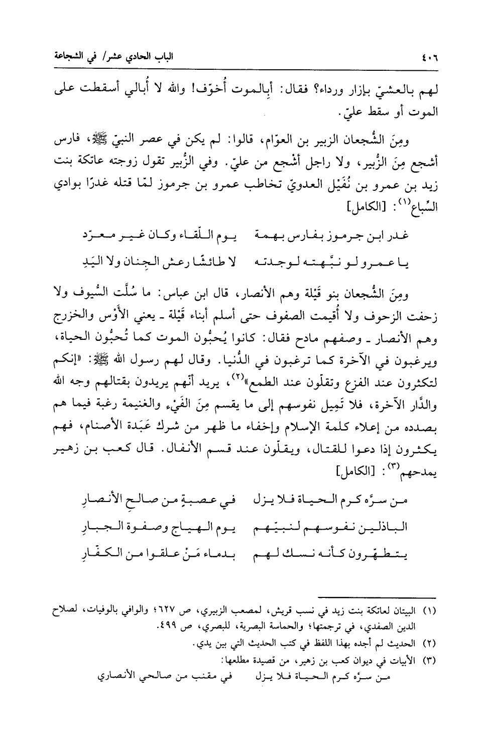 لهم بالعشي بازار ورداء فقال أبا الموت أخوف والله لا أبالي أسقطت على الموت أو سقط علي ومن الشجعان الزبير بن العوام قالوا لم يكن في عصر النبي صلى الله عليه وسلم فارس أشجع من الزبير ولا راجل أشجع من علي وفي الزبير تقول زوجته عاتكة بنت زيد بن عمرو بن نفيل العدوي تخاطب عمرو بن جرموز لما قتله غدراً بوادي السباع