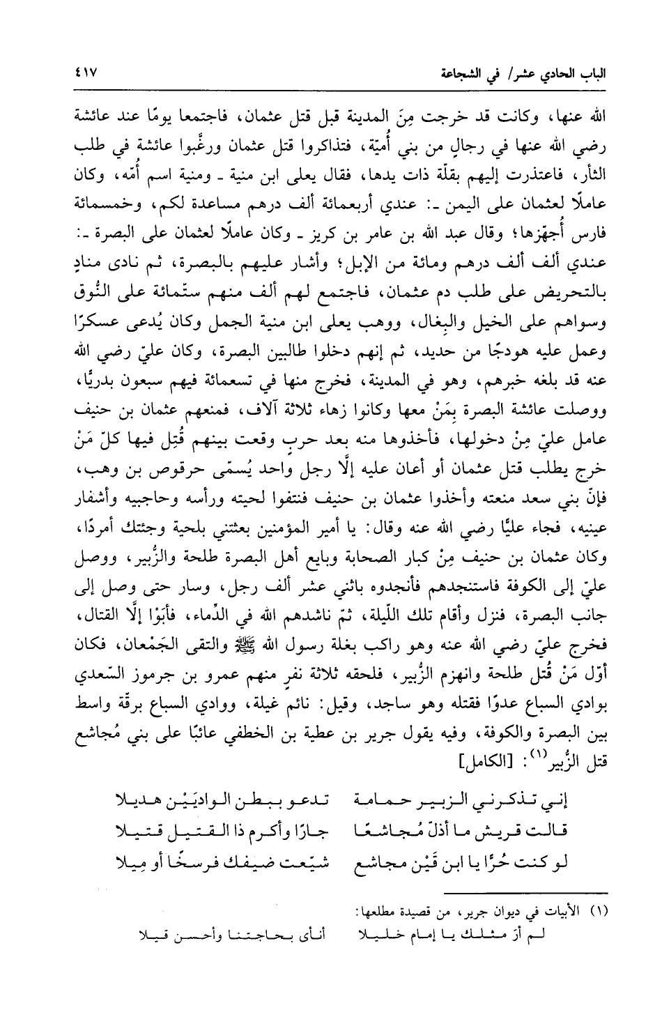 الله عنها وكانت قد خرجت من المدينة قبل قتل عثمان فاجتمعا يوماً عند عائشة رضي الله عنها في رجال من بني أمية فتذاكروا قتل عثمان ورغبوا عائشة في طلب الثار فاعتذرت إليهم بقلة ذات يدها فقال يعلى بن منية ومنية اسم أمه وكان عاملاً لعثمان على اليمن عندي أربعمائة ألف درهم مساعدة لكم وخمسمائة فارس أجهزها وقال عبد الله بن عامر بن كريز وكان عاملاً لعثمان على البصرة عندي ألف ألف درهم ومائة من الابل وأشار عليهم بالبصرة ثم نادى مناد بالتحريض على طلب دم عثمان فاجتمع لهم ألف منهم ستمائه على النوق وسواهم على الخيل والبغال ووهب يعلى بن منية الجمل وكان يدعى عسكراً وعمل عليه هو دجا من حديد ثم إنهم دخلوا طالبين البصرة وكان علي رضي الله عنه قد بلغه خبرهم وهو في المدينة فخرج منها في تسعمائة فيهم سبعون بدرياً ووصلت عائشة البصرة بمن معها وكانوا زهاء ثلاثة آلاف فمنعهم عثمان بن حنيف عامل علي من دخولها فأخذوها منه بعد حرب وقعت بينهم قتل فيها كل من خرج يطلب قتل عثمان أو أعان عليه إلا رجل واحد يسمى حرقوص بن وهب فإن بني سعد منعته وأخذوا عثمان بن حنيف فنتفوا لحيته ورأسه وحاجبيه وأشفار عينيه فجاء علياً رضي الله عنه وقال يا أمير المؤمنين بعثتني بلحية وجئتك أمرد أو كان عثمان بن حنيف من كبار الصحابة وبايع أهل البصرة طلحة والزبير ووصل علي إلى الكوفة فاستنجدهم فأنجدوه باثني عشر ألف رجل وسار حتى وصل إلى جانب البصرة فنزل وأقام تلك الليلة ثم ناشدهم الله في الدماء فأبوا إلا القتال فخرج علي رضي الله عنه وهو راكب بغلة رسول الله صلى الله عليه وسلم والتقى الجمعان فكان أول من قتل طلحة وانهزم الزبير فلحقه ثلاثة نفر منهم عمرو بن جرموز السعدي بوادي السباع عدوا فقتله وهو ساجد وقيل نائم غيلة ووادي السباع برقة واسط بين البصرة والكوفة وفيه يقول جرير بن عطية بن الخطفي عاتباً على بني مجاشع قتل الزبير