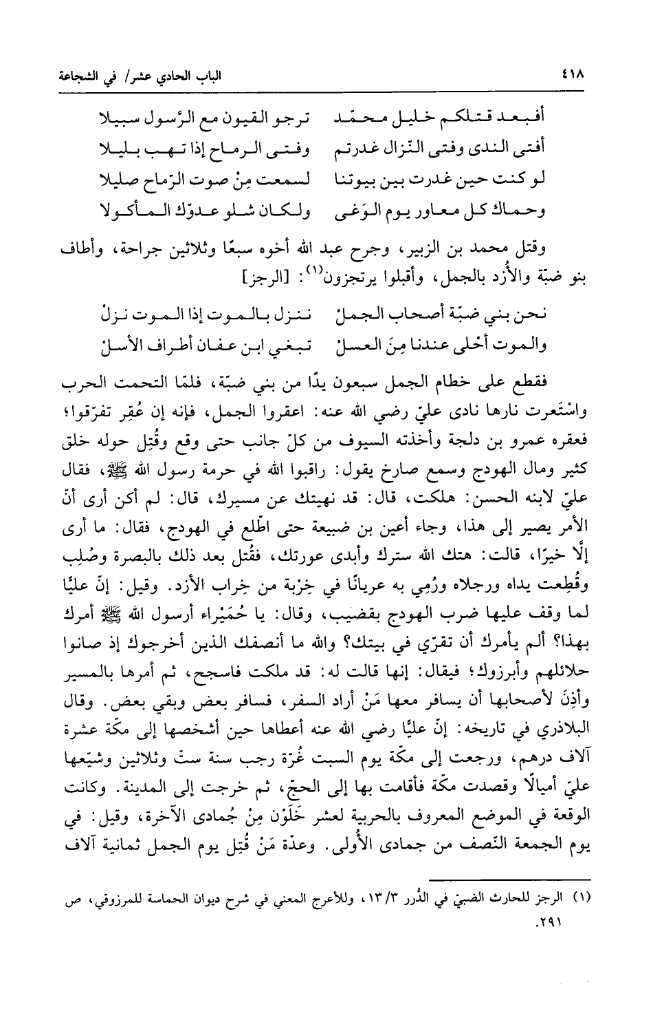 وقتل محمد بن الزبير وجرح عبد الله أخوه سبعاً وثلاثين جراحة وأطاف بنو ضبة والأزد بالجمل واقبلوا يرتجزون