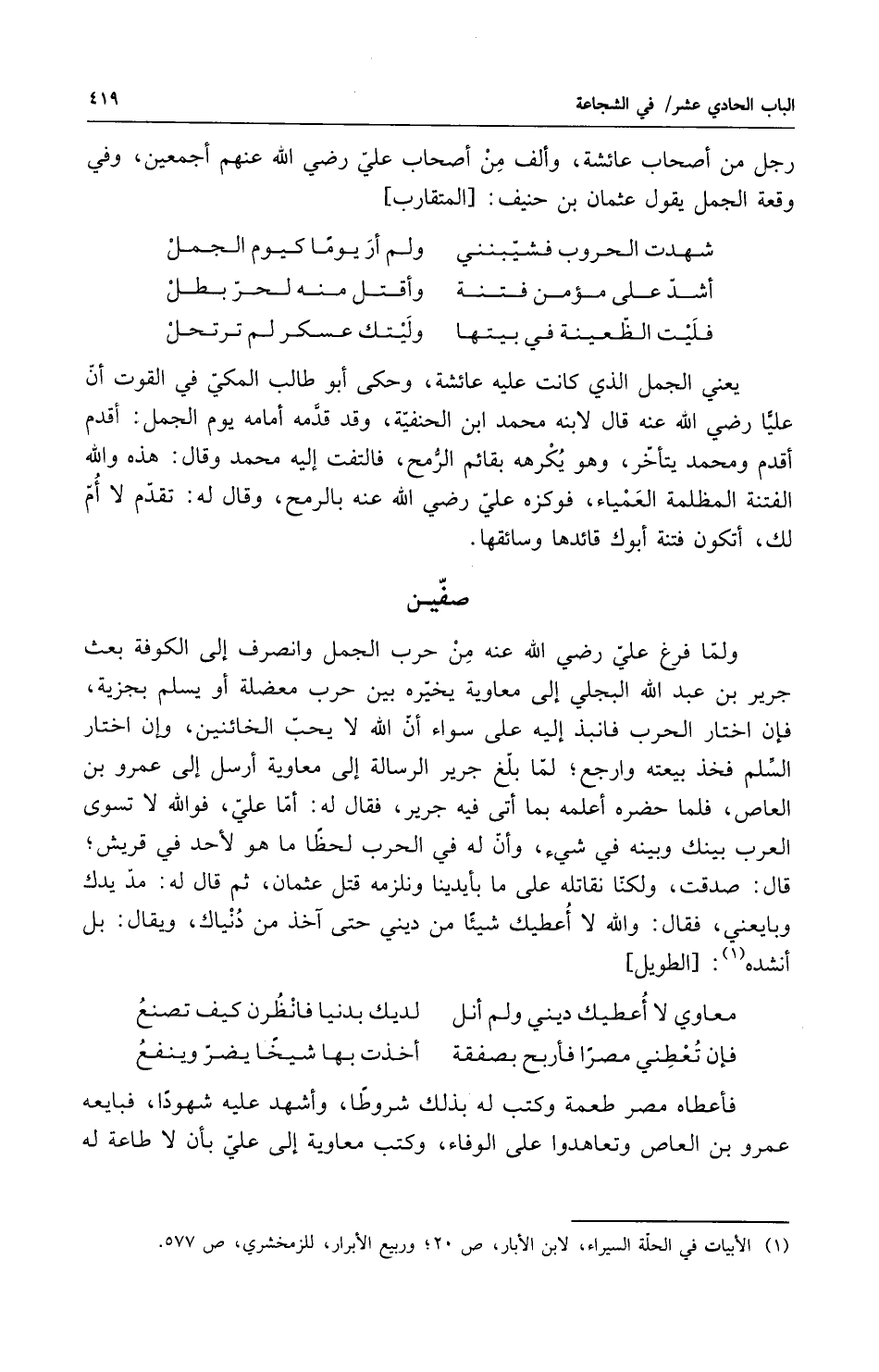 يعني الجمل الذي كانت عليه عائشة وحكى أبو طالب المكي في القوت أن علياً رضي الله عنه قال لابنه محمد بن الحنفية وقد قدمه امامه يوم الجمل أقدم اقدم ومحمد يتأخر وهو يكرهه بقائم الرمح فالتفت إليه محمد وقال هذه والله الفتنة المظلمة العمياء فوكزه علي رضي الله عنه بالرمح وقال له تقدم لا أم لك أتكون فتنة أبوك قائدها وسائقها صفين ولما فرغ علي رضي الله عنه من حرب الجمل وانصرف إلى الكوفة بعث جرير بن عبد الله البجلي إلى معاوية يخيره بين حرب معضلة أو يسلم بجزيه فان اختار الحرب فانبذ إليه على سواء إن الله لا يحب الخائنين وإن اختار السلم فخذ بيعته وارجع فلما بلغ جرير الرسالة إلى معاوية أرسل إلى عمرو بن العاص فلما حضره أعلمه بما أتى فيه جرير فقال له أما علي فوالله لا تسوي العرب بينك وبينه في شيء وإن له في الحرب لحظاً ما هو لأحد في قريش قال صدقت ولكنا نقاتل على ما بأيدينا ونلزمه قتل عثمان ثم قال له مديدك وبايعني فقال والله لا أعطيك شيأً من ديني حتى آخذ من دنياك ويقال بل أنشده
