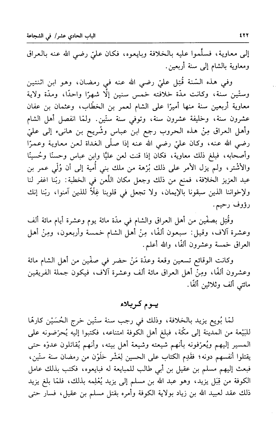 إلى معاوية فسلموا عليه بالخلافة وبايعوه فكان علي رضي الله عنه بالعراق ومعاوية بالشأم إلى سنة أربعين وفي هذه السنة قتل علي رضي الله عنه في رمضان وهو ابن اثنتين وستين سنة وكانت مدة خلافته خمس سنين إلا شهراً واحداً ومدة ولاية معاوية أربعين سنة منها أميراً على الشأم لعمر بن الخطاب وعثمان بن عفان عشرون سنة وخليفة عشرون سنة وتوفي سنة ستين ولما انفصل أهل الشأم وأهل العراق من هذه الحروب رجع ابن عباس وشريح بن هانئ إلى علي رضي الله عنه وكان علي رضي الله عنه إذا صلى الغداة لعن معاوية وعمراً وأصحابه فبلغ ذلك معاوية فكان إذا قنت لعن علياً وابن عباس وحسناً وحسيناً والأشتر ولم يزل الأمر على ذلك برهة من ملك بني أمية إلى أن ولي عمر بن عبد العزيز الخلافة فمنع من ذلك وجعل مكان اللعن في الخطبة ربنا اغفر لنا ولاخواننا الذين سبقونا بالايمان ولا تجعل في قلوبنا غلاً للذين آمنوا ربنا إنك رؤف رحيم وقتل بصفين من أهل العراق والشأم في مدة مائة يوم وعشرة أيام مائة ألف وعشرة آلاف وقيل سبعون ألفاً من أهل الشأم خمسة وأربعون ومن أهل العراق خمسة وعشرون ألفاً والله أعلم وكانت الوقائع تسعين وقعة وعدة من حضر في صفين من أهل الشأم مائة وعشرون ألفاً ومن أهل العراق مائة ألف وعشرة آلاف فيكون جملة الفريقين مائتي ألف وثلاثين ألفاً