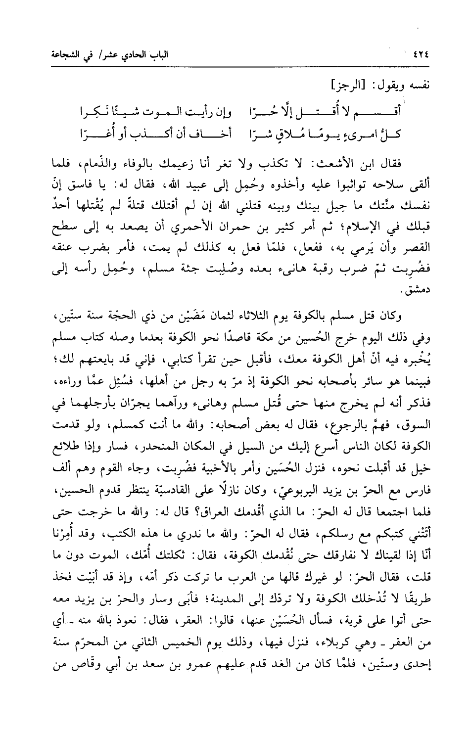 فقال ابن الأشعث لا تكذب ولا تغر أنا زعيمك بالوفاء والذمام فلما ألقى سلاحه تواثبوا عليه وأخذوه وحمل إلى عبيد الله فقال له يا فاسق إن نفسك منتك ما حيل بينك وبينه قتلني الله إن لم أقتلك قتله لم يقتلها أحد قبلك في الاسلام ثم أمر كثير بن حمران الأحمري أن يصعد به إلى سطح القصر وأن يرمي به ففعل فلما فعل به كذلك لم يمت فأمر بضرب عنقه فضربت ثم ضرب رقبة هانئ بعده وصلبت جثة مسلم وحمل رأسه إلى دمشق وكان قتل مسلم بالكوفة يوم الثلاثاء لثمان مضين من ذي الحجة سنة ستين وفي ذلك اليوم خرج الحسين من مكة قاصداً نحو الكوفة بعد ما وصله كتاب مسلم يخبره فيه أن أهل الكوفة معك فأقبل حين تقرأ كتابي فاني قد بايعتهم لك فبينما هو سائر بأصحابه نحو الكوفة إذ مر به رجل من أهلها فسئل عما وراءه فذكر أنه لم يخرج منها حتى قتل مسلم وهانئ ورآهما يجران بأرجلهما في السوق فهم بالرجوع فقال له بعض أصحابه والله ما أنت كمسلم ولو قدمت الكوفة لكان الناس أسرع إليك من السيل في المكان المنحدر فسار وإذا طلائع خيل قد أقبلت نحوه فنزل الحسين وأمر بالأخبية فضربت وجاء القوم وهم ألف فارس مع الحر بن يزيد اليربوعي وكان نازلاً على القادسية ينتظر قدوم الحسين فلما اجتمعا قال له الحر ما الذي أقدمك العراق قال له والله ما خرجت حتى أتتني كتبكم مع رسلكم فقال له الحر والله ما ندري ما هذه الكتب وقد أمرنا انا إذا لقيناك لا نفارقك حتى نقدمك الكوفة فقال ثكلتك أمك الموت دون ما قلت فقال الحر لو غيرك قالها من العرب ما تركت ذكر أمه وإذ قد أبيت فخذ طريقاً لا تدخلك الكوفة ولا تردك إلى المدينة فأبى وسار والحر بن يزيد معه حتى أتوا على قرية فسأل الحسين عنها فقالوا العقر فقال نعوذ بالله منه أي من العقر وهي كربلاء فنزل فيها وذلك يوم الخميس الثاني من المحرم سنة إحدى وستين فلما كان من الغد قدم عليهم عمرو بن سعد بن أبي وقاص من