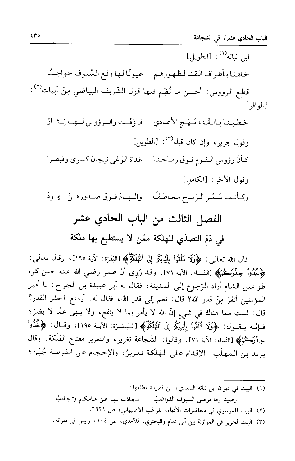 قال الله تعالى ولا تلقوا بأيديكم إلى التهلكة وقال تعالى خذوا حذركم وقد روى أن عمر رضي الله عنه حين كره طواعين الشأم أراد الرجوع إلى المدينة فقال له أبو عبيدة بن الجراح يا أمير المؤمنين أتفر من قدر الله قال نعم إلى قدر الله فقال له أيمنع الحذر القدر قال لست مما هناك في شيء إن الله لا يأمر بما لا ينفع ولا ينهى عما لا يضر فإنه يقول ولا تلقوا بأيديكم إلى التهلكة وقال خذوا حذركم وقالوا الشجاعة تغرير والتغرير مفتاح الهلكة وقال يزيد ابن المهلب الاقدام على الهلكة تغرير والاحجام عن الفرصة جبن