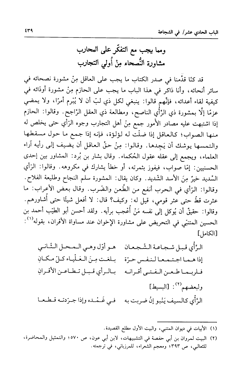 قد كنا منا في صدر الكتاب ما يجب على العاقل من مشورة نصحائه في سائر أنحائه وانا ذاكر في هذا الباب ما يجب على الحازم من مشورة أودائه في كيفية لقاء أعدائه فإنهم قالوا ينبغي لكل ذي لب أن لا يبرم أمراً ولا يمضي عزماً إلا بمشورة ذي الرأي الناصح ومطالعة ذي العقل الراجح وقالوا الحازم إذا اشتبهت عليه مصادر الأمور جمع من أهل التجارب وجوه الرأي حتى يخلص له منها الصواب كالعاقل إذا ضلت له لؤلؤة فإنه إذا جمع ما حول مسقطها والتمسها يوشك أن يجدها وقالوا من حق العاقل أن يضيف إلى رأيه آراء العلماء ويجمع إلى عقله عقول الحكماء وقال بشار بن برد المشاور بين إحدى الحسنيين أما صواب فيفوز بثمرته أو خطا يشارك في مكروهه وقالوا الرأي السديد خير من الأسد الشديد وكان يقال المشورة سلم النجاح وطليعة الفلاح وقالوا الرأي في الحرب أنفع من الطعن والضرب وقال بعض الأعراب ما عثرت قط حتى عثر قومي قيل له وكيف قال لا أفعل شيأً حتى أشاورهم وقالوا حقيق أن يوكل إلى نفسه من أعجب برأيه ولقد أحسن أبو الطيب أحمد بن الحسين المتنبي في التحريض على مشاورة الاخوان عند مساواة الأقران بقوله