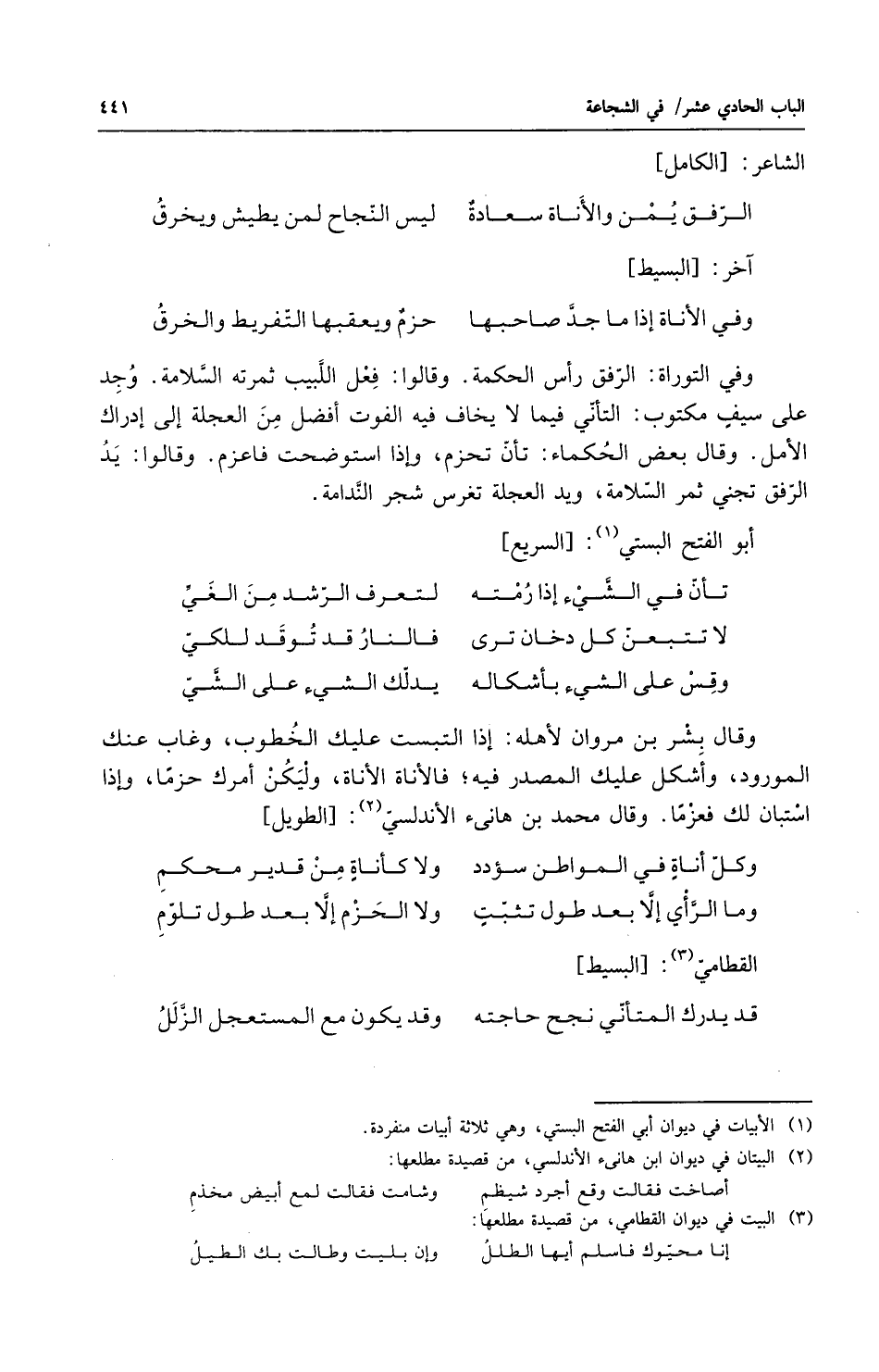 وفي التورية الرفق رأس الحكمة وقالوا فعل اللبيب ثمرته السلامة وجد على سيف مكتوب التأني فيما لا يخاف فيه الفوت أفضل من العجلة إلى إدراك الأمل وقال بعض الحكماء تأن تحزم وإذا استوضحت فاعزم وقالوا يد الرفق تجني ثمر السلامة ويد العجله تغرس شجر الندامة أبو الفتح البستي