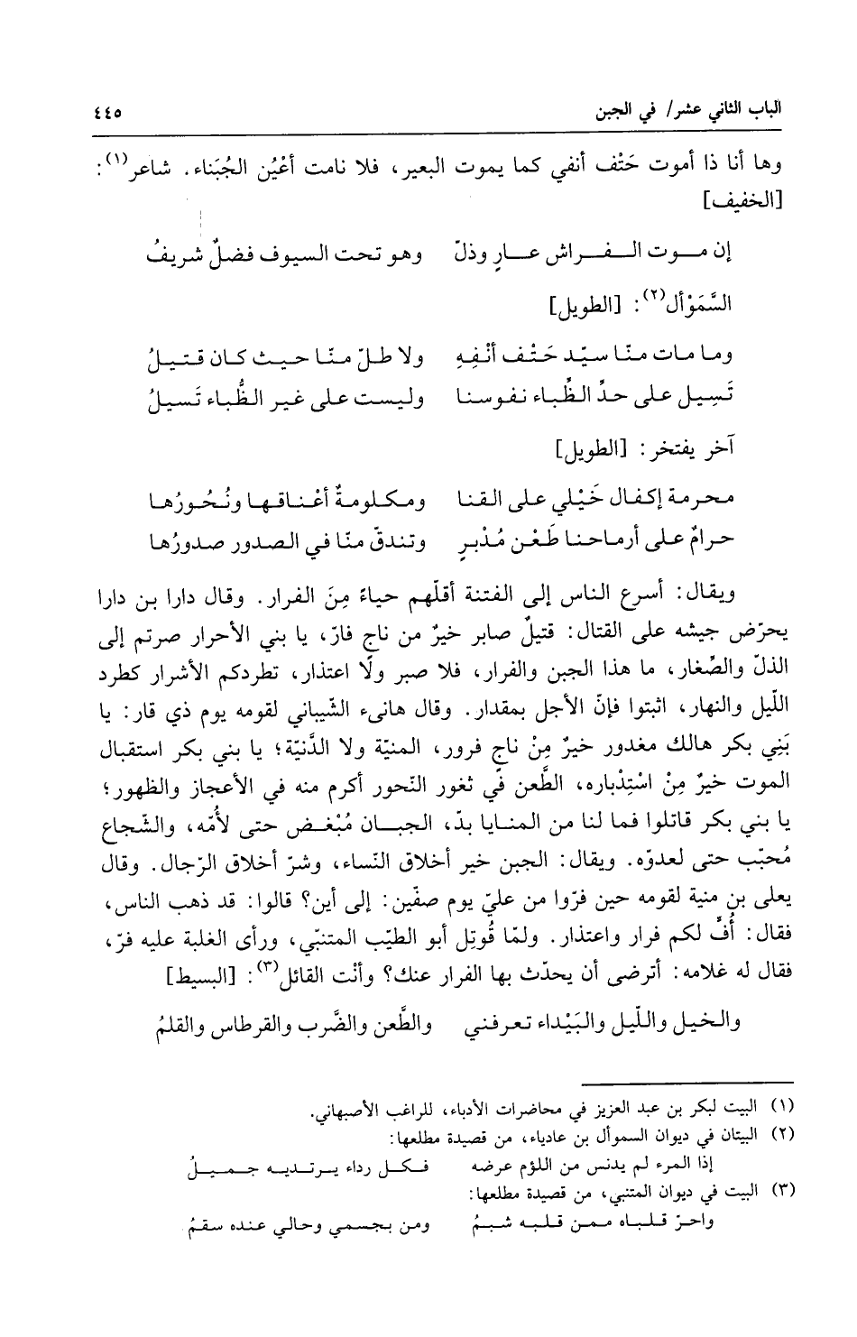 ويقال أسرع الناس إلى الفتنة أقلهم حياء من الفرار وقال دارا بن دارا يحرض جيشه على القتال قتيل صابر خير من ناج فار يا بني الأحرار صرتم إلى الذل والصغار ما هذا الجبن والفرار فلا صبر ولا اعتذار تطردكم الأشرار كطرد الليل النهار أثبتوا فإن الأجل بمقدار وقال هانئ الشيباني لقومه يوم ذي قار يا بني بكر هالك مغدور خير من ناج فرور المنية ولا الدنية يا بني بكر استقبال الموت خير من استدباره الطعن في ثغور النحور أكرم منه في الاعجاز والظهور يا بني بكر قاتلوا فمالنا من المنايا بد الجبان مبغض حتى لامه والشجاع محبب حتى لعدوه ويقال الجبن خير أخلاق النساء وشر أخلاق الرجال وقال يعلى بن منية لقومه حين فروا من على يوم صفين إلى أين قالوا قد ذهب الناس فقال أف لكم فرار واعتذار ولما قوتل أبو الطيب المتنبي ورأى الغلبة عليه فر فقال له غلامه أترضى أن يحدث بهذا الفرار عنك وأنت القائل