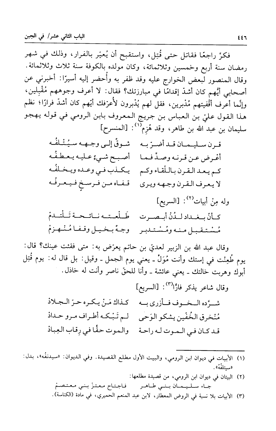 فكر راجعاً فقاتل حتى قتل واستقبح أن يعير بالفرار وذلك في شهر رمضان سنة أربع وخمسين وثلثمائة وكان مولده بالكوفة سنة ثلاث وثلثمائة وقال المنصور لبعض الخوارج عليه وقد ظفر به وأحضر إليه أسيراً أخبرني عن أصحابي أيهم كان أشد اقداماً في مبارزتك فقال لا أعرف وجوههم مقبلين وإنما أعرف أقفيتهم مدبرين فقل لهم يدبرون لأعرفك أيهم كان أشد فراراً نظم هذا القول علي بن العباس بن جريج المعروف بابن الرومي في قوله يهجو سليمان بن عبد الله بن ظاهر وقد هزم