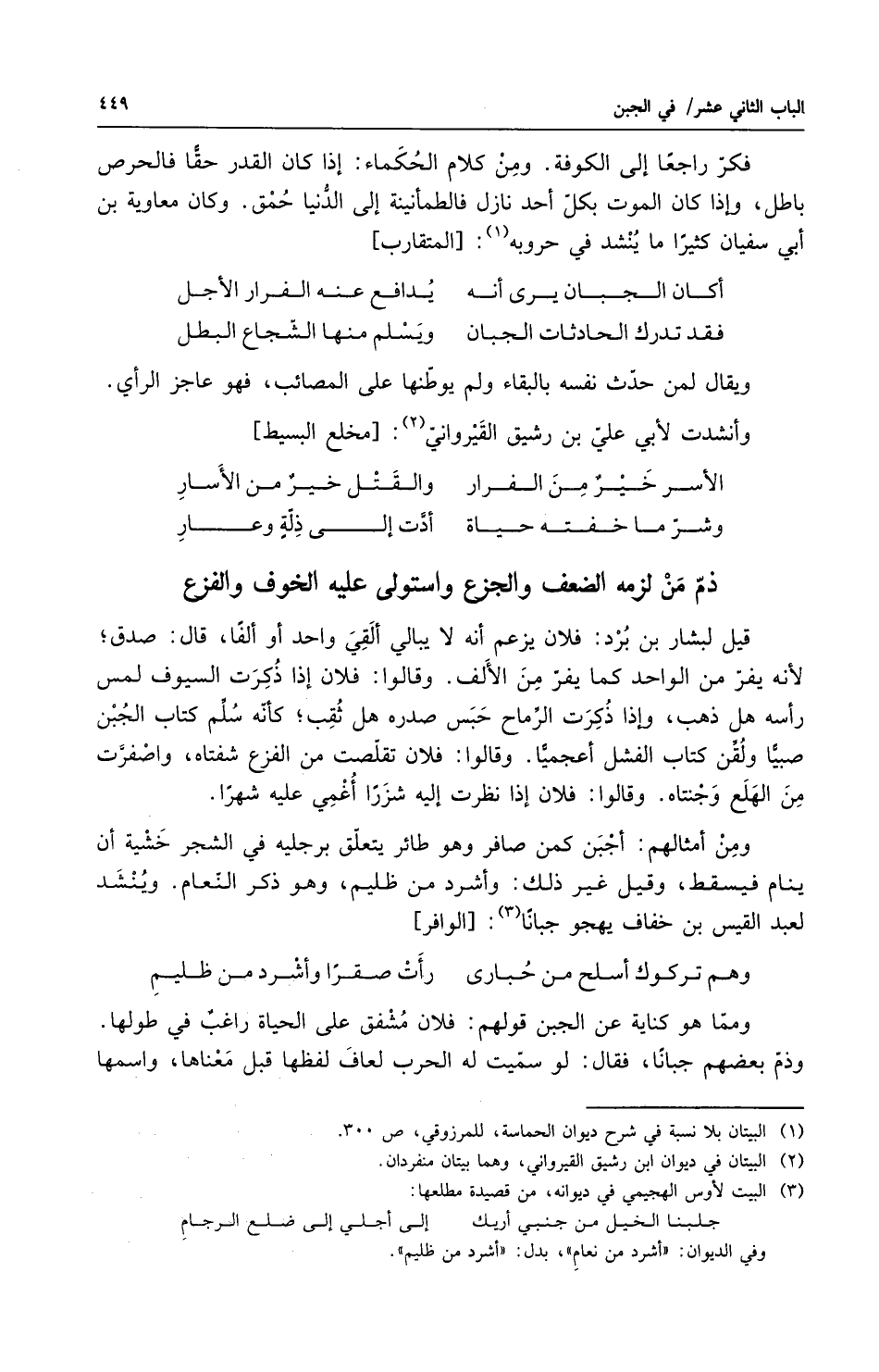 قيل لبشار بن برد فلان يزعم إنه لا يبالي ألقى واحداً أو ألفاً قال صدق لأنه يفر من الواحد كما يفر من الألف وقالوا فلان إذا ذكرت السيوف لمس رأسه هل ذهب وإذا ذكرت الرماح جس صدره هل ثقب كأنه سلم كتاب الجبن صبياً ولقن كتاب الفشل أعجمياً وقالوا فلان تقلصت من الفزع شفتاه واصفرت من الهلع وجنتاه وقالوا فلان إذا نظرت إليه شزراً أغمى عليه شهراً ومن أمثالهم أجبن من صافر وهو طائر يتعلق برجليه في الشجر خشية أن ينام فيسقط وقيل غير ذلك وأشرد من ظليم وهو ذكر النعام وينشد لعبد القيس ابن خفاف يهجو جبانا