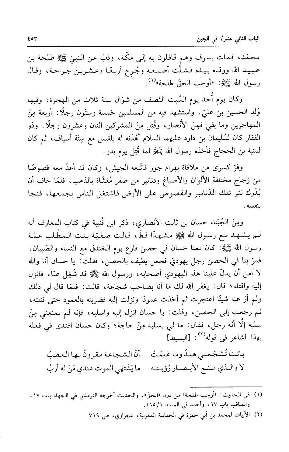 محمد فات بسرف وهم قافلون به إلى مكة وذب عن النبي صلى الله عليه وسلم طلحة بن عبيد الله ووقاه ببده فشلت اصبعه وجرح أربعاً وعشرين جراحة وقال رسول الله صلى الله عليه وسلم أوجب الحق طلحة وكان يوم أحد يوم السبت النصف من شوال سنة ثلاث من الهجرة وفيها ولد الحسن بن علي واستشهد فيه من المسلمين خمسة وستون رجلاً أربعة من المهاجرين وما بقي فمن الأنصار وقتل من المشركين اثنان وعشرون رجلاً وذو الفقار كان لسليمان بن داود عليهما السلام أهدته له بلقيس مع ستة أسياف ثم كان لمنية بن الحجاج فأخذه رسول الله صلى الله عليه وسلم لما قتل يوم بدر وفر كسرى من ملاقاة بهرام جور فاتبعه الجيش وكان قد أعد معه فصوصاً من زجاج مختلفة الألوان والأصباغ ودنانير من صفر مغشاة بالذهب فلما خاف أن يدرك نثر تلك الدنانير والفصوص على الأرض فاشتغل الناس بجمعها فنجا بنفسه ومن الجبناء حسان بن ثابت الأنصاري ذكر ابن قتيبة في كتاب المعارف أنه لم يشهد مع رسول الله صلى الله عليه وسلم مشهدا قط قالت صفية بنت المطلب عمة رسول الله صلى الله عليه وسلم كان معنا حسان في حصن فارع يوم الخندق مع النساء والصبيان فمر بنا في الحصن رجل يهودي فجعل يطيف بالحصن فقلت يا حسان أنا والله لا آمن أن يدل علينا هذا اليهودي أصحابه ورسول الله صلى الله عليه وسلم قد شغل عنا فانزل إليه واقتله قال يغفر الله لك ما أنا بصاحب شجاعة قالت فلما قال لي ذلك ولم أر عنده شيأً اعتجرت ثم أخذت عموداً ونزلت إليه فضربته بالعمود حتى قتلته ثم رجعت إلى الحصن وقلت يا حسان انزل إليه واسلبه فإنه لم يمنعني من سلبه إلا أنه رجل فقال مالي بسلبه من حاجة وكان حسان اقتدى في فعله بهذا الشاعر في قوله