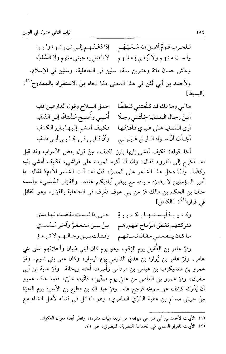 أخذ قوله فكيف أمشي إليها بارز الكتف من قول بعض الأعراب وقد قيل له اخرج إلى الغزو فقال والله أنا أكره الموت على فراشي فكيف أمشي إليه ركضاً ولما دخل هذا الشاعر على المعتز قال له أنت الشاعر الآدم فقال يا أمير المؤمنين لا يضره سواده مع بيض أياديكم عنده والفرار السلمي واسمه حنان ابن الحكم بن مالك فر من بني عوف فعرف في الجاهلية بالفرار وهو القائل في فراره