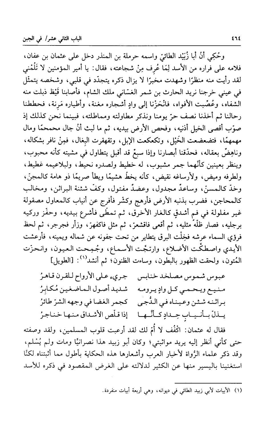 فقال له عثمان اكفف لا أم لك لقد أرعبت قلوب المسلمين ولقد وصفته حتى كأني أنظر إليه يريد مواثبتي وكان أبو زبيد هذا نصرانياً ومات ولم يسلم وقد ذكر علما الرواة لأخبار العرب وأشعارها هذه الحكاية بأطول مما أثبتناه لكنا استغنينا باليسير منها عن الكثير لدلالته على الغرض المقصود في ذكره للأسد