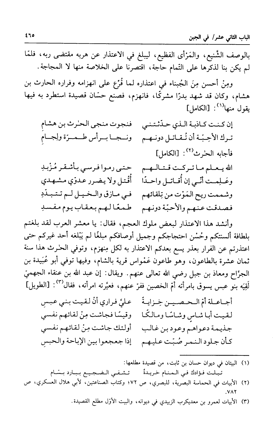 بالوصف الشنيع والمرأى الفظيع ليبلغ في الاعتذار عن هربه مقتضى أربه فلما لم يكن بنا لذكرها على التمام حاجة اقتصرنا على الخلاصة منها لا المجاجة من أحسن من الجبناء في اعتذاره لما قرع على انهزامه وفراره الحرث ابن هشام وكان قد شهد بدراً مشركاً فانهزم فصنع حسان قصيدة استطرد به فيها يقول منها
