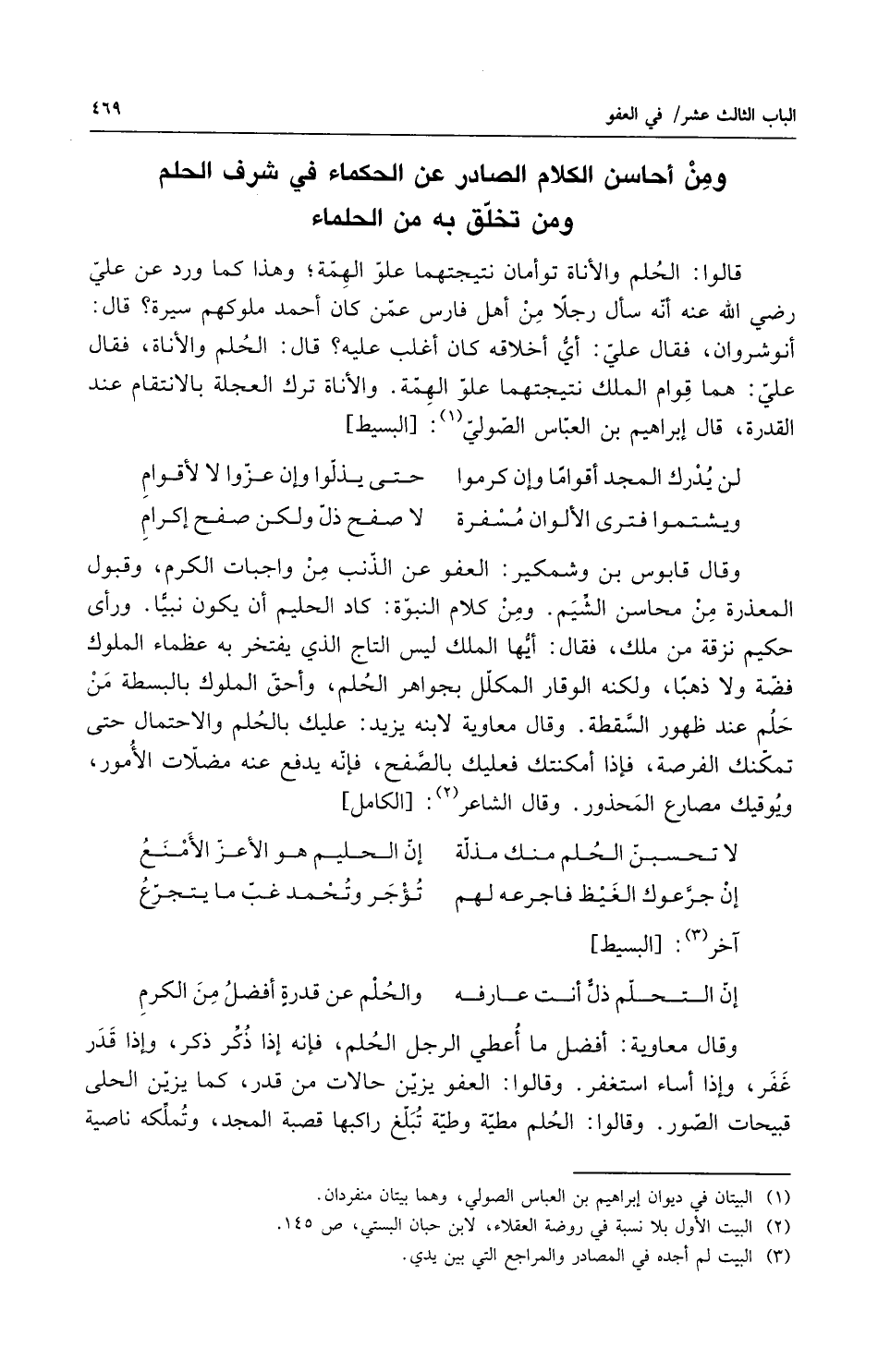 ومن أحاسن الكلام الصادر عن الحكماء في شرف الحلم ومن تخلق به من الحلماء قالوا الحلم والأناة توأمان نتيجتهما علو الهمة وهذا كما ورد عن علي رضي الله عنه أنه سأل رجلاً من أهل فارس عمن كان أحمد ملوكهم سيرة قال أنوشروان فقال علي أي أخلاقه كان أغلب عليه قال الحلم والأناة فقال على هما قوام الملك نتيجتهما علو الهمة والأناة ترك العجلة بالانتقام عند القدرة قال إبراهيم بن العباس الصولي