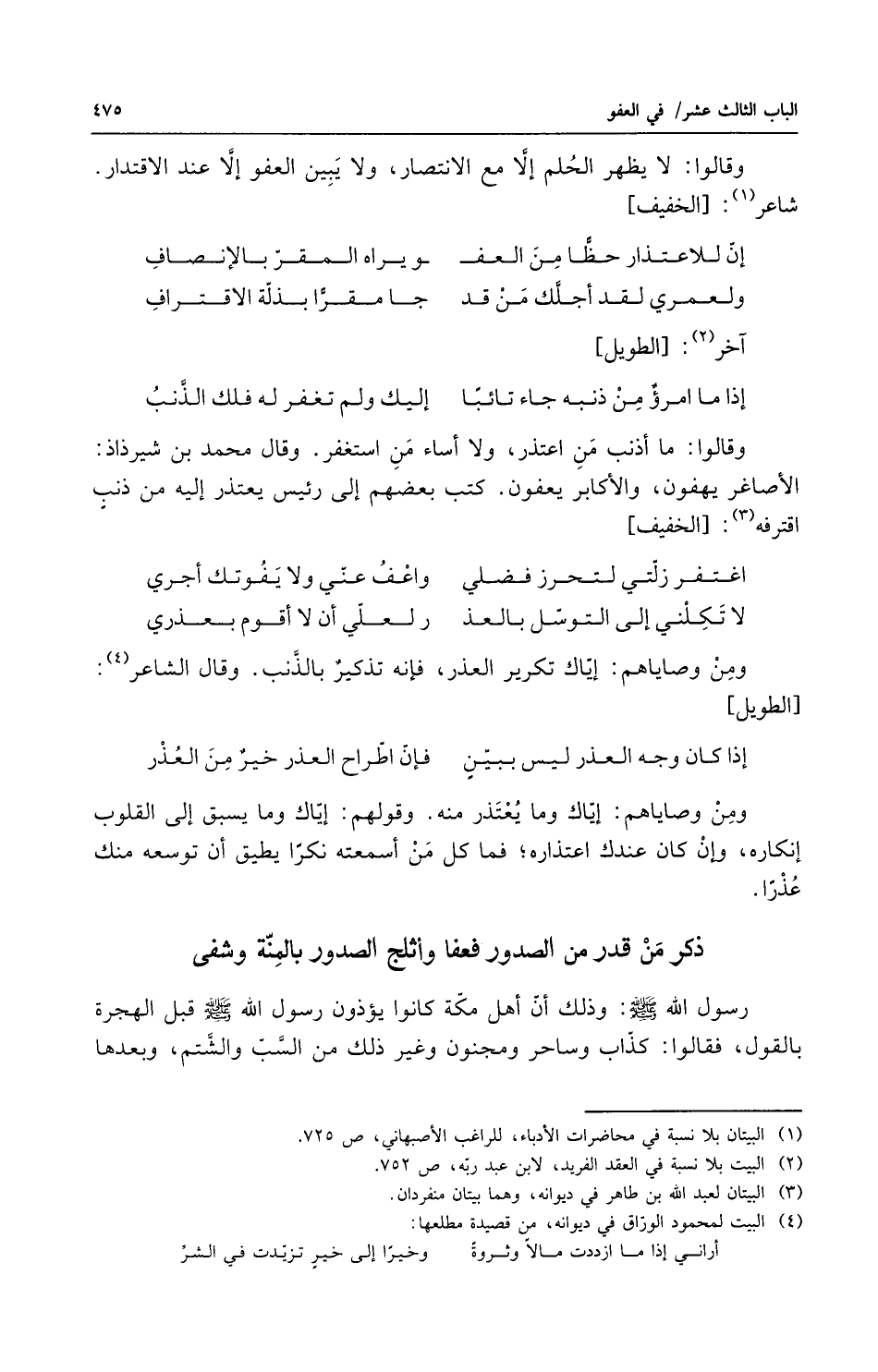 وقالوا ما أذنب من اعتذر ولا أساء من استغفر وقال محمد بن شيرذاذ الأصاغر يهفون والأكابر يعفون كتب بعضهم إلى رئيس يعتذر إليه من ذنب اقترفه