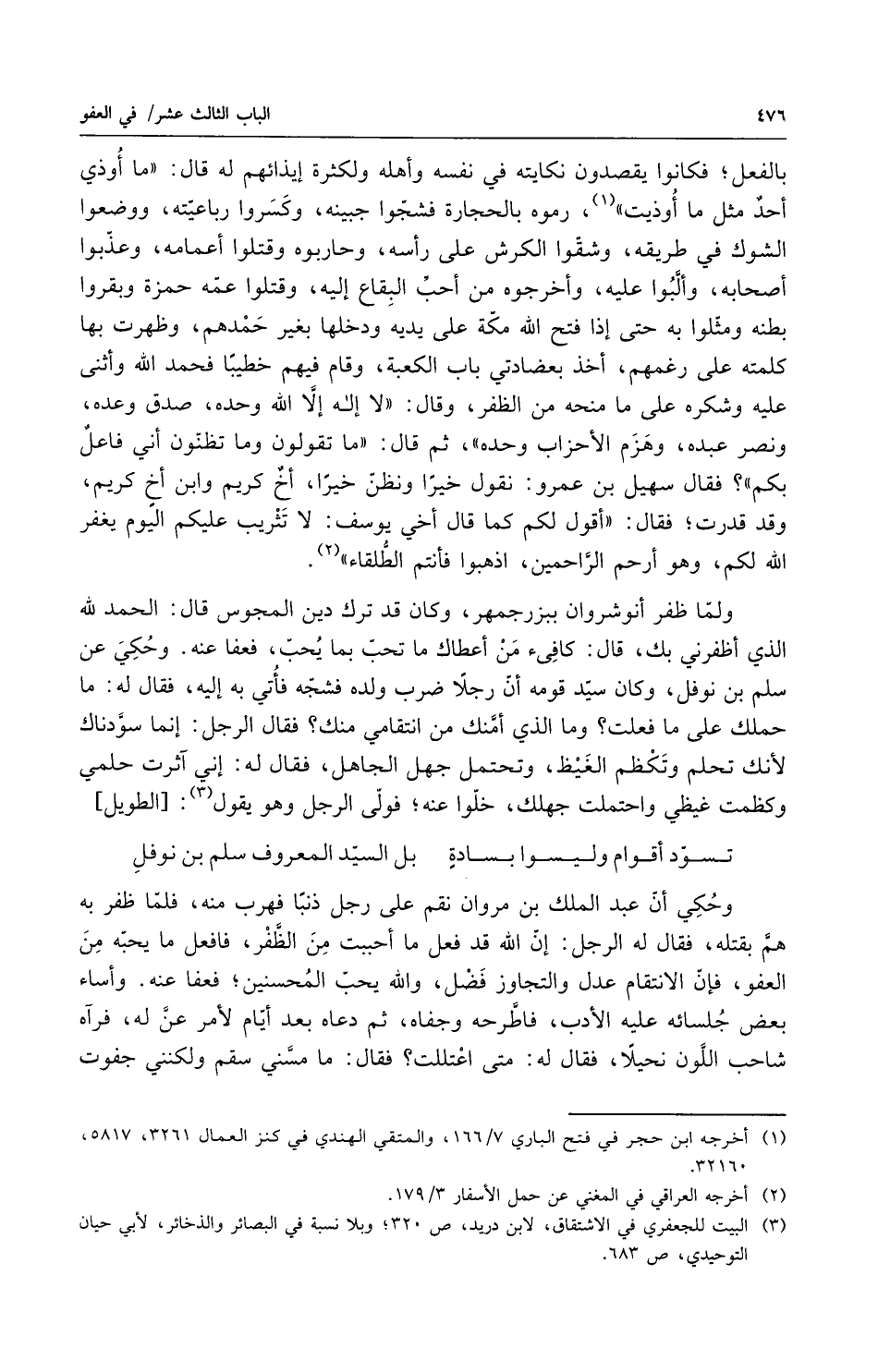 بالفعل فكانوا يقصدون نكايته في نفسه وأهله ولكثرة ايذائهم له قال ما أوذي أحد مثل ما أوذيت رموه بالحجارة فشجوا جبينه وكسروا رباعيته ووضعوا الشوك في طريقه وشقوا الكرش على رأسه وحاربوه وقتلوا أعمامه وعذبوا أصحابه وألبوا عليه وأخرجوه من أحب البقاع إليه وقتلوا عمه حمزة وبقروا بطنه ومثلوا به حتى إذا فتح الله مكة على يديه ودخلها بغير حمدهم وظهرت بها كلمته على رغمهم أخذ بعضادتي باب الكعبة وقام فيهم خطيباً فحمد الله وأثنى عليه وشكره على ما منحه من الظفر وقال لا إله إلا الله وحده صدق وعده ونصر عبده وهزم الأحزاب وحده ثم قال ما تقولون وما تظنون إني فاعل بكم فقال سهل بن عمرو ونقول خبراً ونظن خيراً أخ كريم وابن أخي كريم وقد قدرت فقال أقول لكم كما قال أخي يوسف لا تثريب عليكم اليوم يغفر الله لكم وهو أرحم الراحمين اذهبوا فأنتم الطلقاء ولما ظفر انوشروان ببزرجمهر وكان قد ترك دين المجوس قال الحمد لله الذي أظفرني بك قال كافئ من أعطاك ما تحب بما يحب فعفا عنه وحكى عن سلم بن نوفل وكان سيد قومه أن رجلاً ضرب ولده فشجه فأتى به إليه فقال له ما حملك على ما فعلت وما الذي أمنك من انتقامي منك فقال الرجل إنما سودناك لأنك تحلم وتكظم الغيظ وتحتمل جهل الجاهل فقال له إني آثرت حلمي وكظمت غيظي واحتملت جهلك خلواً عنه فولي الرجل وهو يقول
