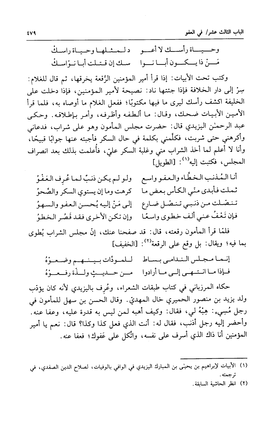 فلما قرأ المأمون رقعته قال قد صفحنا عنك فإن مجلس الشراب يطوي بما فيه ويقال بل وقع على الرقعة