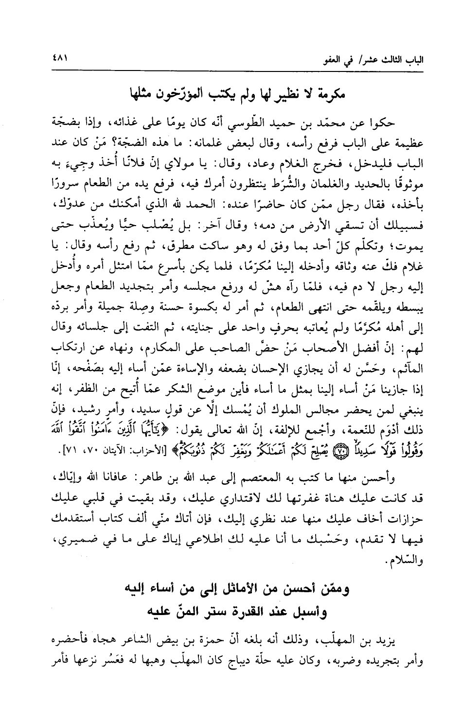 حكوا عن محمد بن حميد الطوسي أنه كان يوماً على غذائه وإذا بضجة عظيمة على الباب فرفع رأسه وقال لبعض غلمانه ما هذه الضجة من كان عند الباب فليدخل فخرج الغلام وعاد وقال يا مولاي إن فلاناً أخذ وجئ به موثوقاً بالحديد والغلمان والشرط ينتظرون أمرك فيه فرفع يده من الطعام سروراً بأخذه فقال رجل ممن كان حاضراً عنده الحمد لله الذي أمكنك من عدوك فسبيلك أن تسقي الأرض من دمه وقال آخر بل يصلب حياً ويعذب حتى يموت وتكلم كل أحد بما وفق له وهو ساكت مطرق ثم رفع رأسه وقال يا غلام فك عنه وثاقه وأدخله إلينا مكرماً فلم يكن بأسرع مما امتثل أمره وأدخل إليه رجل لا دم فيه فلما رآه هش له ورفع مجلسه وأمر بتجديد الطعام وجعل يبسطه ويلقمه حتى انتهى الطعام ثم أمر له بكسوة حسنة وصلة جميلة وأمر برده إلى أهله مكرماً ولم يعاتبه بحرف واحد على جنايته ثم التفت إلى جلسائه وقال لهم إن أفضل الأصحاب من حض الصاحب على المكارم ونهاه عن ارتكاب المآثم وحسن له أن يجازي الاحسان بضعفه والاساءة عمن أساء إليه بصفحه انا إذا جازينا من أساء إلينا بمثل ما أساء فأين موضع الشكر عما أتيح من الظفر إنه ينبغي لمن يحضر مجالس الملوك أن يمسك الاعن قول سديد وأمر رشيد فإن ذلك أدوم للنعمة وأجمع للألفة إن الله تعالى يقول يا أيها الذين آمنوا اتقوا الله وقولوا قولاً سديداً يصلح لكم أعمالكم ويغفر لكم ذنوبكم وأحسن منها ما كتب به المعتصم إلى عبد الله بن طاهر عافانا الله وإياك قد كانت عليك هناة غفرتها لك لاقتداري عليك وقد بقيت في قلبي عليك حزازات أخاف عليك منها عند نظري إليك فإن أتاك مني ألف كتاب استقدمك فيها فلا تقدم وحسبك معرفة ما أنا عليه لك اطلاعي إياك على ما في ضميري والسلام