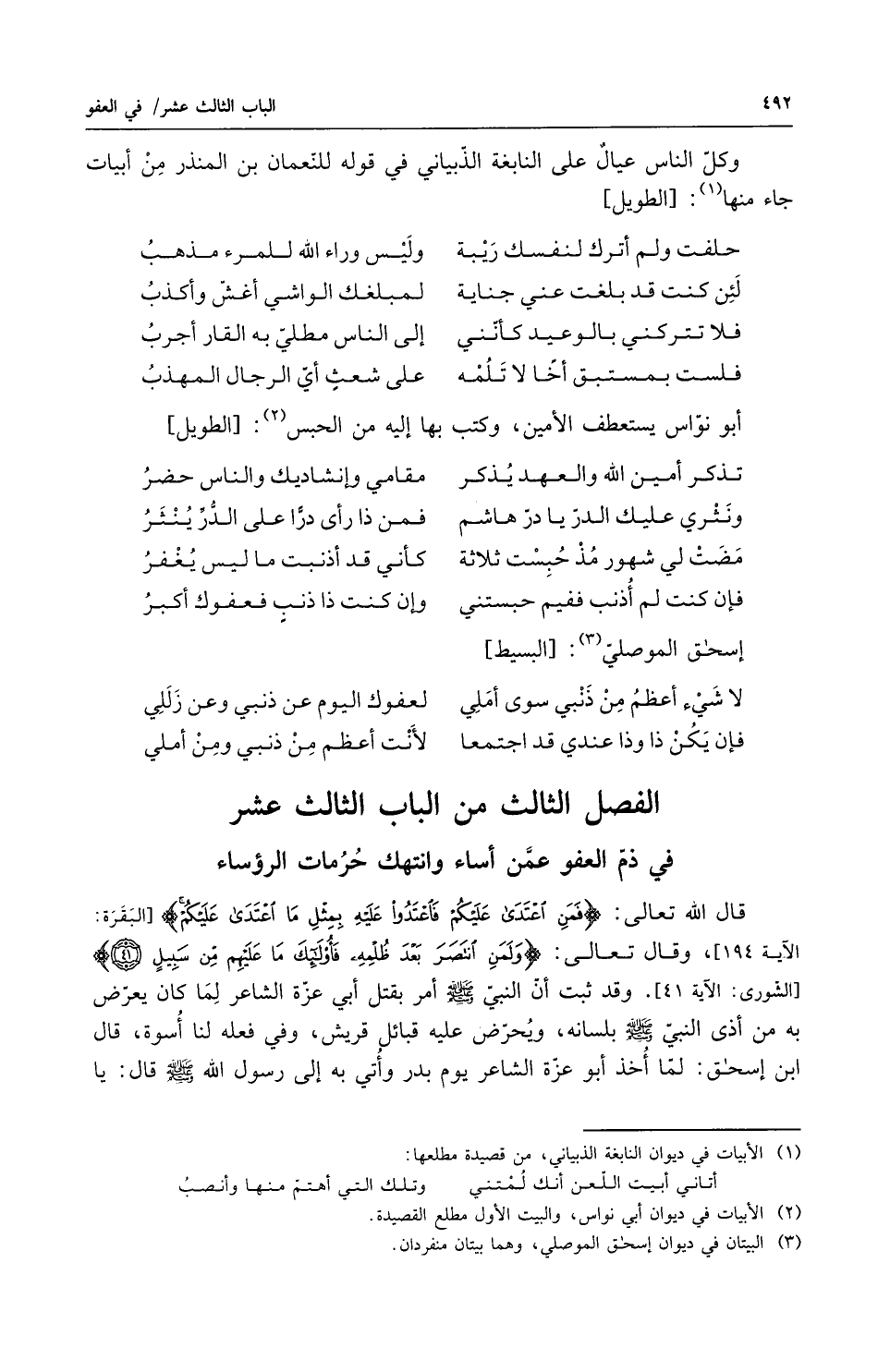 قال الله تعالى فمن اعتدى عليكم فاعتدوا عليه بمثل ما اعتدى عليكم وقال تعالى ولمن انتصر بعد ظلمه فأولئك ما عليهم من سبيل وقد ثبت أن النبي صلى الله عليه وسلم أمر بقتل أبي عزة الشاعر لما كان يعرض به من أذى النبي صلى الله عليه وسلم بلسانه ويحرض عليه قبائل قريش وفي فعله لنا اسوة قال ابن إسحق لما أخذ أبو عزة الشاعر يوم بدر وأتى به إلى رسول الله صلى الله عليه وسلم قال يا