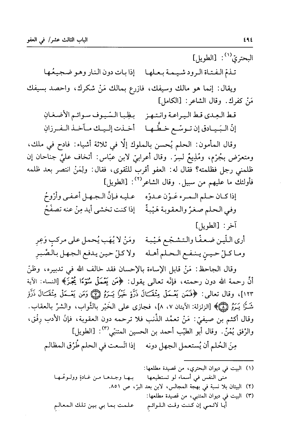 وقال المأمون الحلم يحسن بالملوك إلا في ثلاثة أشياء فادح في ملك ومتعرض بجرم ومذيع لسر وقال أعرابي لابن عباس أتخاف علي جناحاً إن ظلمني رجل فظلمته فقال له العفو أقرب للتقوى فقال ولمن انتصر بعد ظلمه فأولئك ما عليهم من سبيل وقال الشاعر