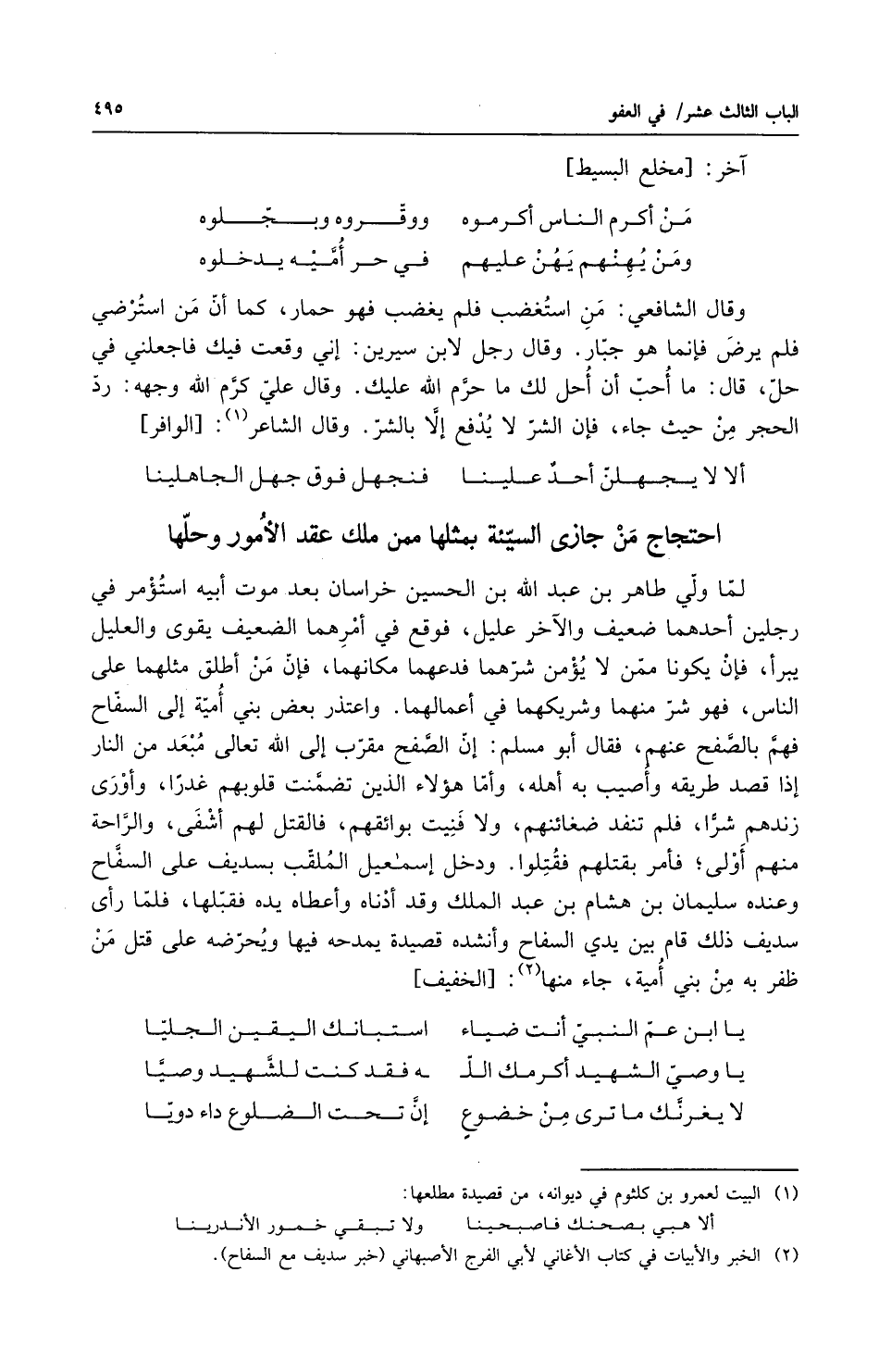 لما ولي طاهر بن عبد الله بن الحسين خراسان بعد موت أبيه استؤمر في رجلين أحدهما ضعيف والآخر عليل فوقع في أمرهما الضعيف يقوى والعليل يبرأ فإن يكونا ممن لا يؤمن شرهما فدعهما مكانهما فإن من أطلق مثلهما على الناس فهو شر منهما وشريكهما في أعمالهما واعتذر بعض بني أمية إلى السفاح فهم بالصفح عنهم فقال أبو مسلم إن الصفح مقرب إلى الله تعالى مبعد من النار إذا قصد طريقه وأصيب به أهله وأما هؤلاء الذين تضمنت قلوبهم غدراً وأورى زندهم شراً فلم تنفد ضغائنهم ولا ننيب بوائقهم فالقتل لهم أشفى والراحة منهم أولى فأمر بقتلهم فقتلوا ودخل إسمعيل الملقب بسديف على السفاح وعنده سليمان بن هشام بن عبد الملك وقد أدناه وأعطاه يده فقبلها فلما رأى سديف ذلك قام بين يدي السفاح وأنشده قصيدة يمدحه فيها ويحرضه على قتل من ظفر به من بني أمية جاء منها