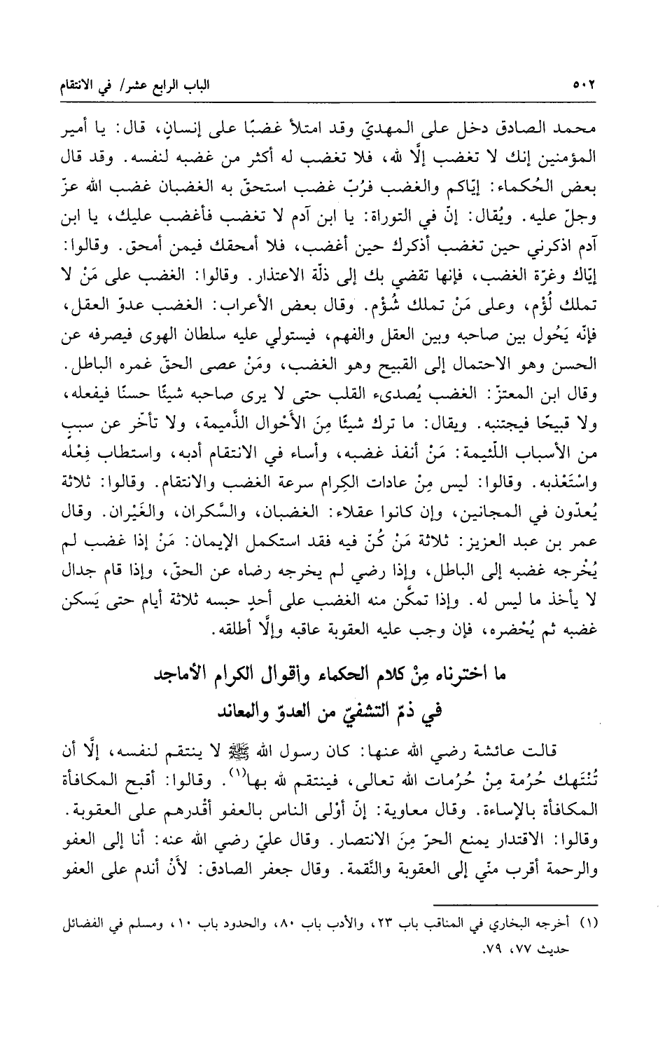 في ذم التشفي من العدو والمعاند قالت عائشة رضي الله عنها كان رسول الله صلى الله عليه وسلم لا ينتقم لنفسه إلا أن تنتهك حرمة من حرمات الله تعالى فينتقم لله بها وقالوا أقبح المكافأة المكافأة بالاساءة وقال معاوية إن أولى الناس بالعفو أقدرهم على العقوبة وقالوا الاقتدار يمنع الحر من الانتصار وقال علي رضي الله عنه أنا إلى العفو والرحمة أقرب مني إلى العقوبة والنقمة وقال جعفر الصادق لان أندم على العفو
